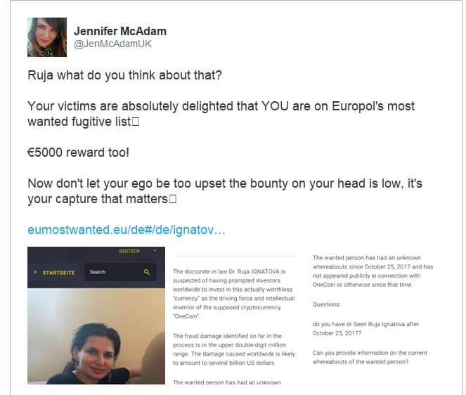 Die neuen Fahndungsmaßnahmen haben in der internationalen OneCoin-Kennerschar ein lebhaftes Echo ausgelöst. Jamie Bartlett (BBC) wundert sich auf Twitter über die 5000 Euro Belohnung. Eine andere Userin fordert Ignatova auf aufzugeben. Das sei doch wohl kein besonders schönes Leben, wenn man das erbeutete Geld gar nicht ausgeben kann, wenn man untergetaucht sei. Und ein Dritter vermutet, Ruja sei inzwischen „100 %a man by now.“ Jennifer McAdam tweetet, Rujas Opfer seien überglücklich, dass sie nun auf der „Most-Wanted“-Liste gelandet sei.