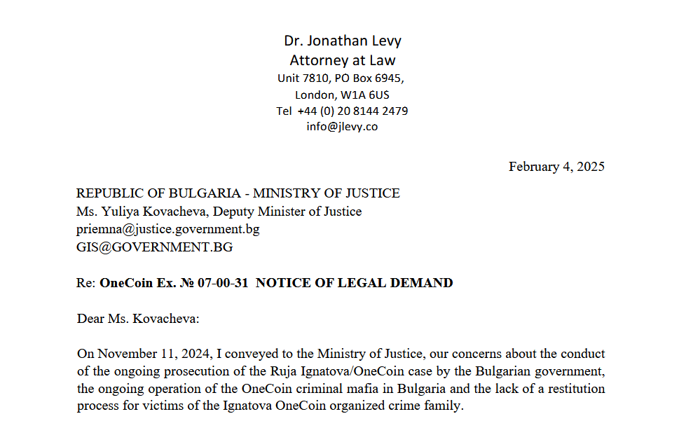 Sofia/Münster/Darmstadt. Der Londoner Rechtsanwalt Jonathan Levy hat in einem Schreiben an das bulgarische Justizministerium beklagt, dass die dortigen Behörden nichts gegen OneCoin und ihre Hintermänner unternähmen. Es sei für die Opfer, „besonders schmerzvoll, dass OneCoin weiterhin von Sofia aus operiert“.