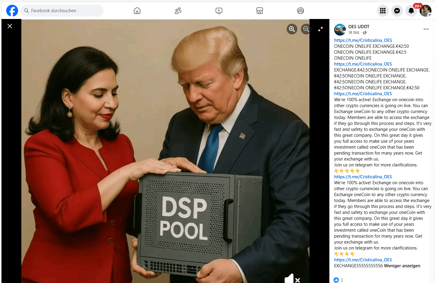 Um zu beweisen, wie seriös er arbeitet, hat Calina sogar ein Foto von Ruja Ignatova beigefügt, auf dem sie „Donald Trump“ ein Kästchen überreicht. Ab sofort könne man OneCoin in jede andere Kryptowährung tauschen. Also wer jetzt immer noch nicht überzeugt ist, dem ist wohl nicht zu helfen.