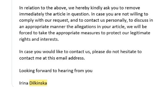 Ihm schrieb Dilkinska am 11. Februar 2015, also noch ganz zu Beginn der OneCoin-Geschichte, sollte er seinen Blog-Post über OneCoin nicht löschen, werde OneCoin gezwungen sein, die notwendigen Maßnahmen zu ergreifen, „um unsere legitimen Rechte und Interessen zu schützen“.