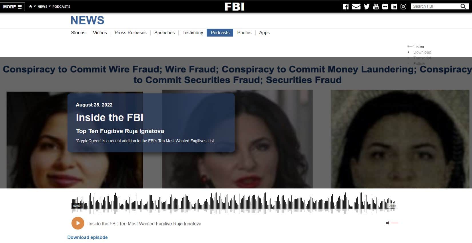 Erst hat sie es auf die Top-Ten Liste des FBI geschafft – und nun hat die US-Polizei der OneCoin Gründerin und selbsternannten Cryptoqueen sogar einen eigenen Podcast gewidmet. „Inside the FBI“ berichtet über die „Top-Ten-Geflohene Ruja Ignatova“.
