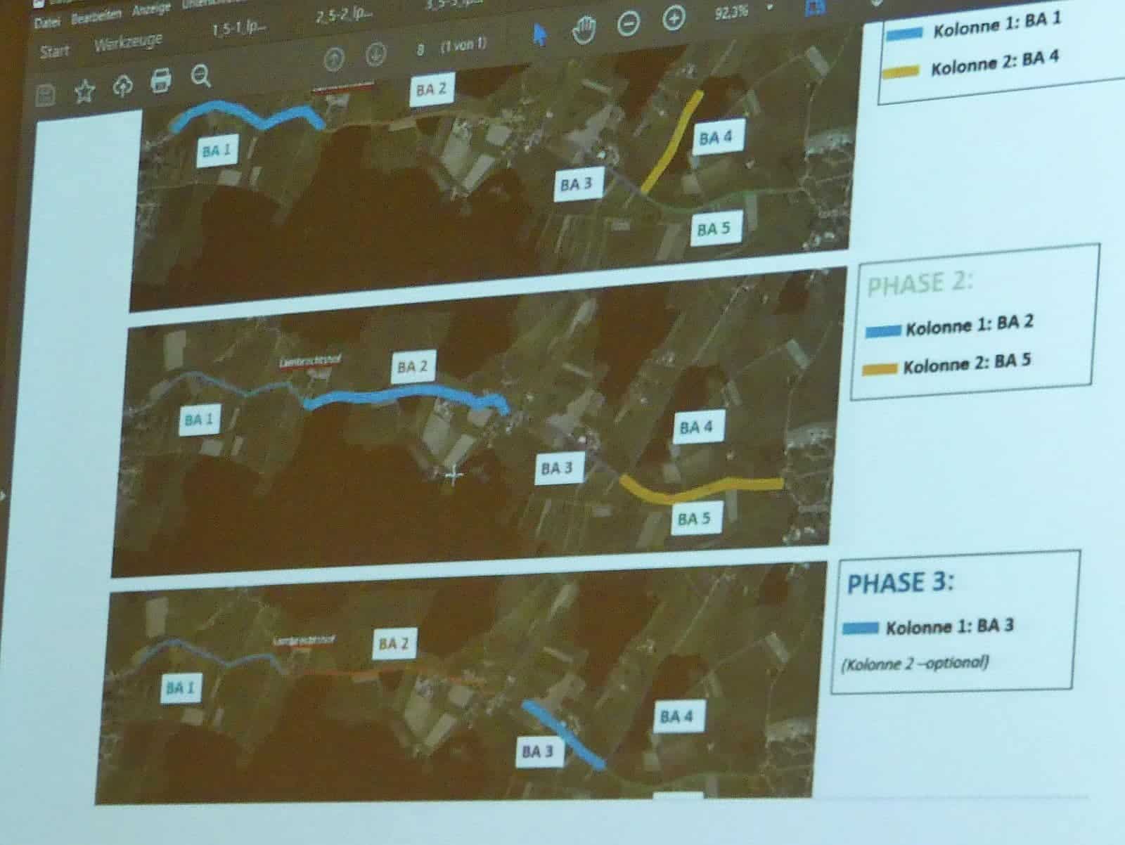 Um die Bauarbeiten rechtzeitig abschließe zu können, werde man die Arbeiten so ausschreiben, dass jeweils zwei Kolonnen gleichzeitig arbeiten können. Insgesamt sind drei Bauphasen mit fünf Bauabschnitten geplant. Dann sollte die Baufirma Ende August 2023 fertig sein und die Maßnahme, wie vorgeschrieben Ende 23 in Berlin abgerechnet werden können.