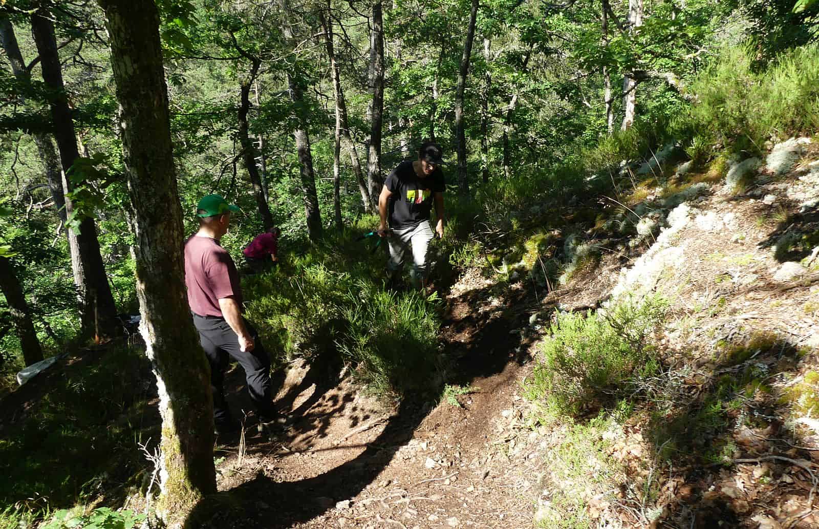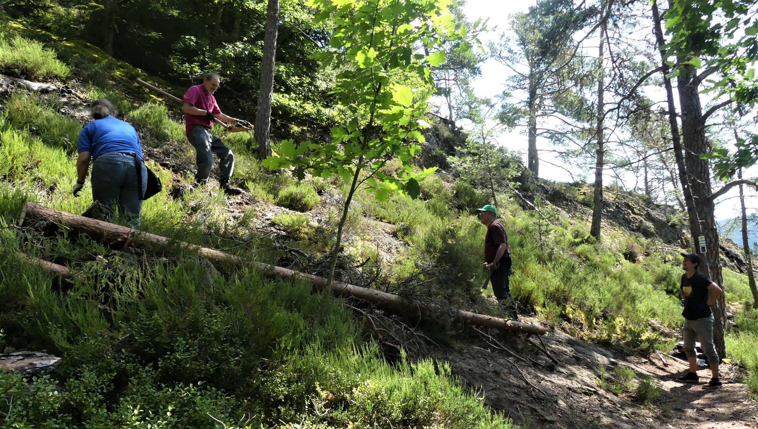 Nach einem Artikel in der NRWZ über Mountainbiker auf schmalen Pfaden hatte der Autor des Berichts zu einer gemeinsamen Reparaturaktion am Premiumwanderweg „Burgenpfad“ aufgerufen. Am zwei stark beschädigten Stellen haben der städtische Umweltbeauftragte Karl Pröbstle, zwei Freiwillige aus Schramberg und als einziger Mountainbiker André Plarre aus Kirchzarten sowie der Initiator der Aktion dafür gesorgt, dass der Fels nicht weiter blank gefahren wird und dass die Wanderer eine Alternative bekommen, gefahrlos an einer ausgefahrenen Wegkurve vorbei zu kommen.