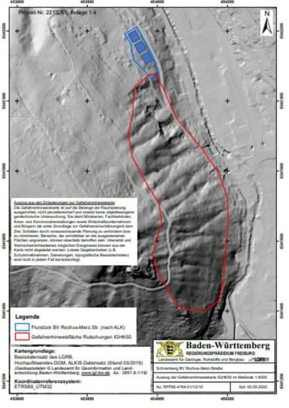 Fazit des Diplom-Geologen Karsten Eichstädt: „Für das Baufenster liegt somit – auch nach der Beurteilung der zuständigen Behörde (LGRB) – keine Rutschgefährdung vor und wird auch nicht durch die geplante Bebauung hervorgerufen.“