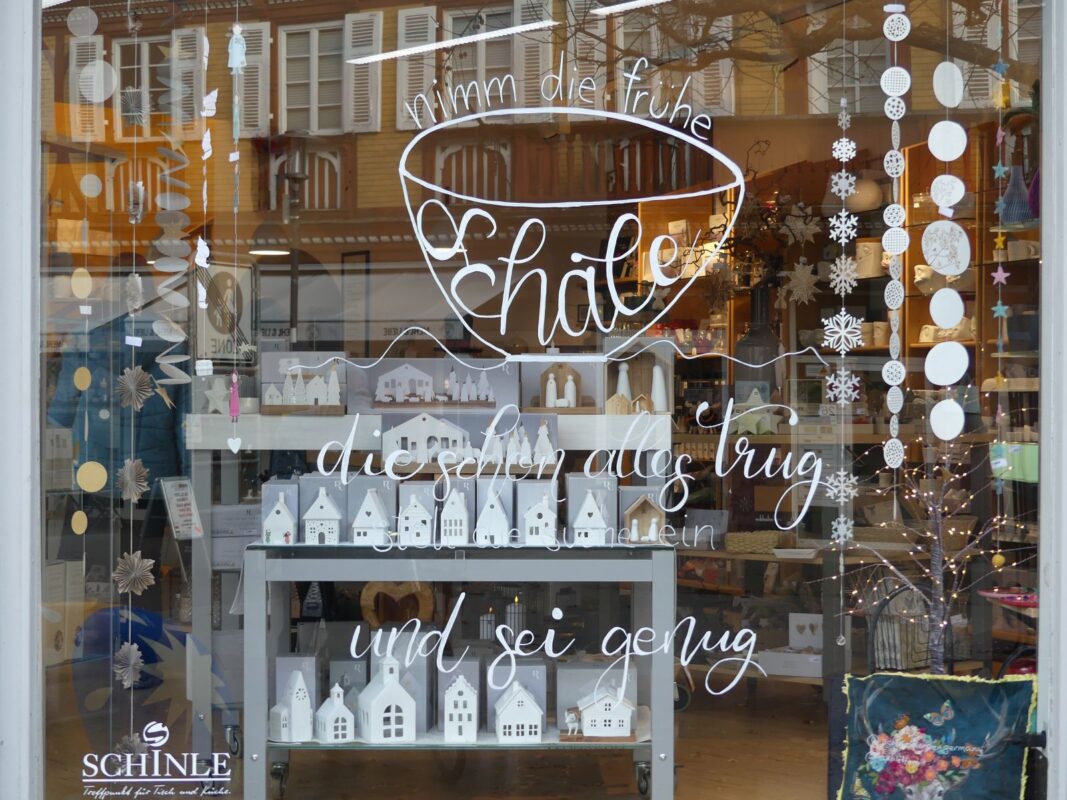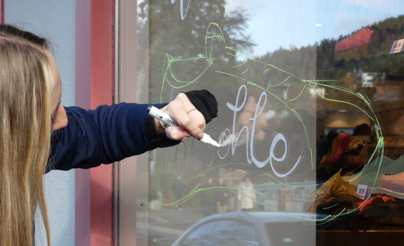 Manche Sprüche malt sie direkt auf die Scheiben. In anderen Fällen hängen die Schriftzüge auf Leinwand gemalt oder liegen auf Holz- oder auch Schiefertafeln im Schaufenster. Schmid, die bei Schneider Schreibgeräte in Tennenbronn hauptberuflich als Messe- und Eventmanagerin arbeitet, möchte damit die ganze Bandbreite der Möglichkeiten des Handlettering zeigen. „Zeigen, was man mit Schrift alles machen kann.“