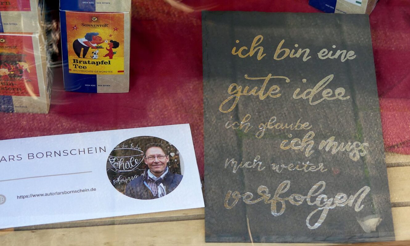 Als auch Bornschein spontan „Feuer und Flamme“ gewesen sei, war das Projekt geboren. „Die Sprüche sollen Lust drauf machen, mehr zu entdecken“, so Klausmann. Bornschein habe seine Texte an die teilnehmenden Geschäfte angepasst. Schmid machte erste Skizzen mit Bleistift und Papier. Seit Anfang der Woche setzt sie ihre Ideen um.