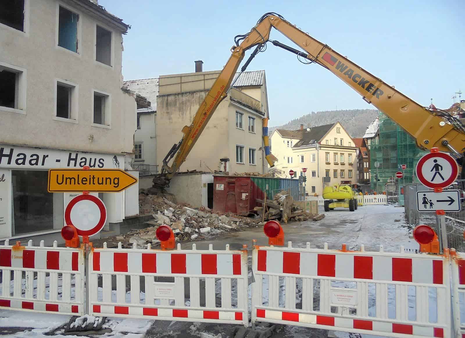 Für dieses Fernziel hat die Stadt in den letzten Jahren die Häuser an der Lauterbacher-Straße und an der Geißhaldenstraße aufgekauft. Sobald die Gebäude Spitznagel, das Eckhaus und die angrenzende ehemalige Apotheke Lemcke abgeräumt sind, werden die Abbruchspezialisten noch die beiden Häuser direkt nach dem Tunnel abbrechen.