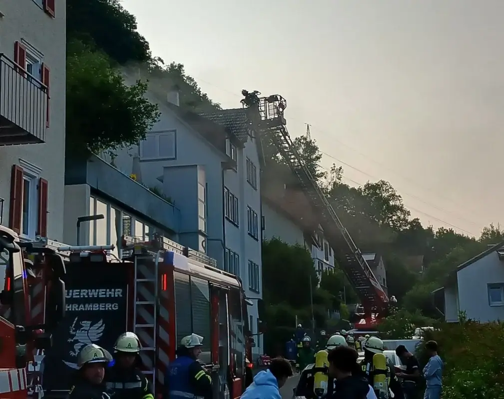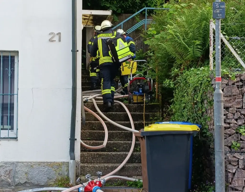 Rauch dringt aus einer Wohnung eines Gebäudes im Schramberger Burgweg – die Feuerwehr ist an diesem Pfingstmontag dort im Großeinsatz.