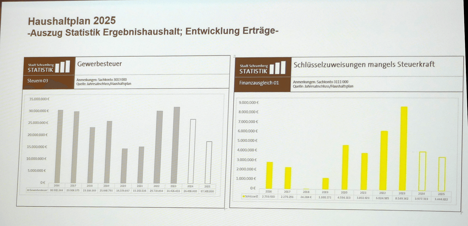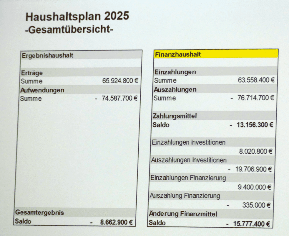 Nach den Haushaltsreden hat Kämmerer Klemens Walter dem Gemeinderat nochmals die wichtigsten Haushaltsdaten und die Entwicklungen der letzten Jahre vorgestellt. Für das Jahr 2025 erwartet er ein Loch von 8,66 Millionen Euro im Ergebnishaushalt.