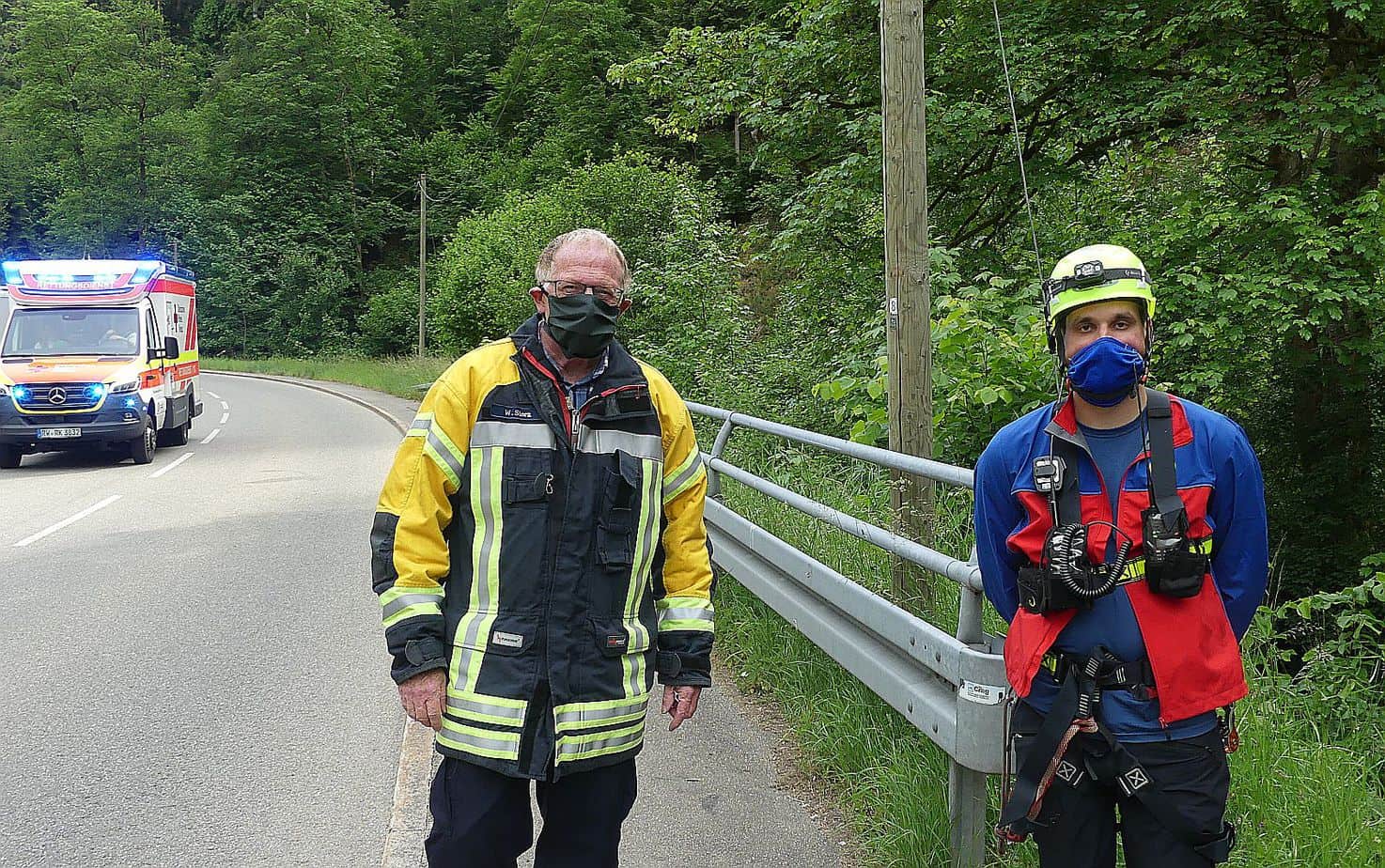 Stadtbrandmeister Werner Storz und Dominik Weiss von der Bergwacht nach dem Einsatz. Fotos: him