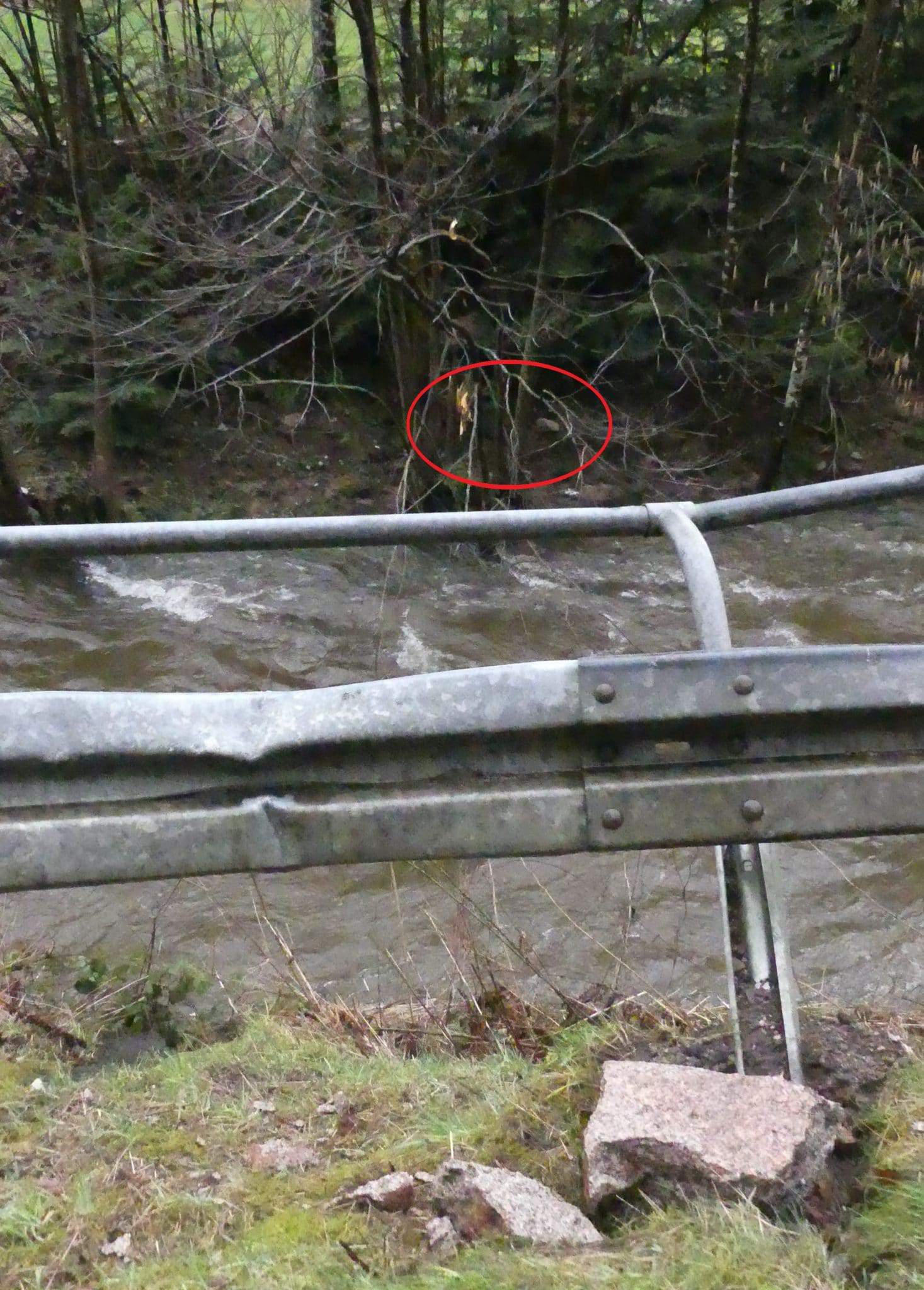 Ein Brocken war auf die Straße geknallt, hatte dann die Leitplanke eingedellt und war über die Schiltach geflogen. Dort hat der Stein noch einen Baum abgeknickt und ist dann in der Uferböschung liegen geblieben. Das zeigt, mit welcher Energie die Steine zu Tal gehen – und wie gefährlich die Lage weiterhin ist.