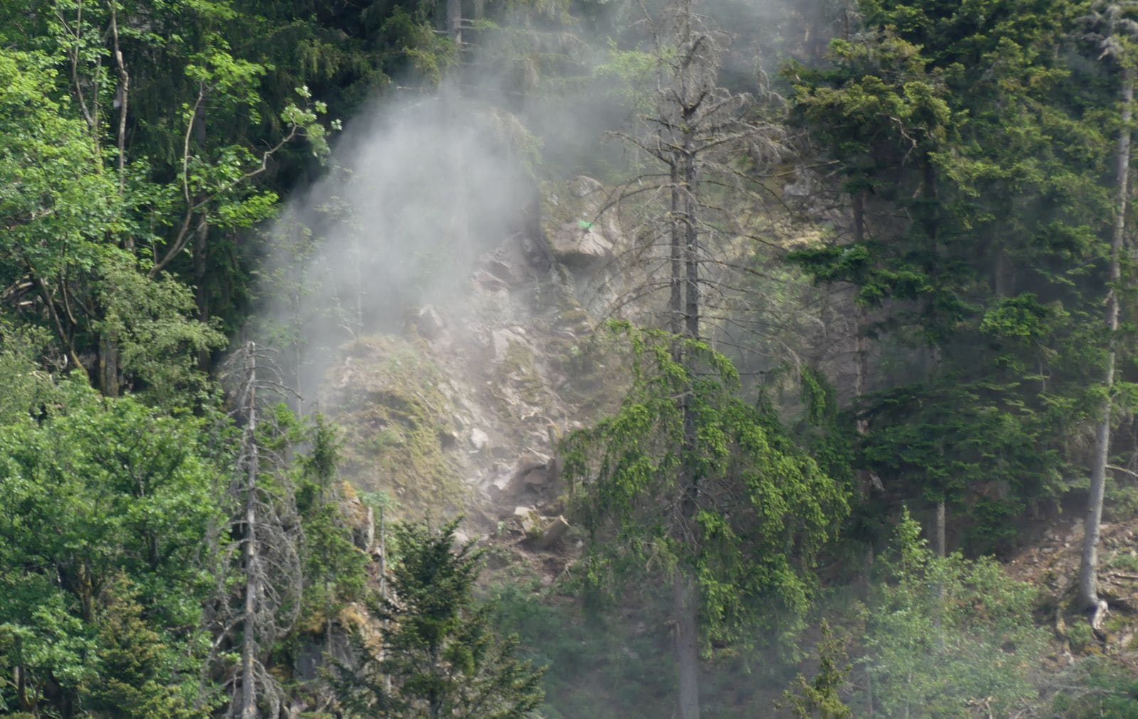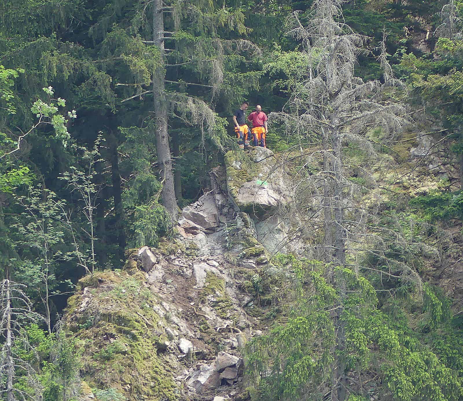 Am Mittwochnachmittag stand die Sprengung eines absturzgefährdeten Felsens an. Der Geologe und Gutachter Andreas Menzel und sein Team hatten den gesamten Hang beim Rappenfelsen untersucht. Die Mineure hatten in den vergangenen Wochen und Monaten schon viele Felsbrocken zu Tal befördert. Dieser Brocken aber war zu groß und musste jetzt gesprengt werden.