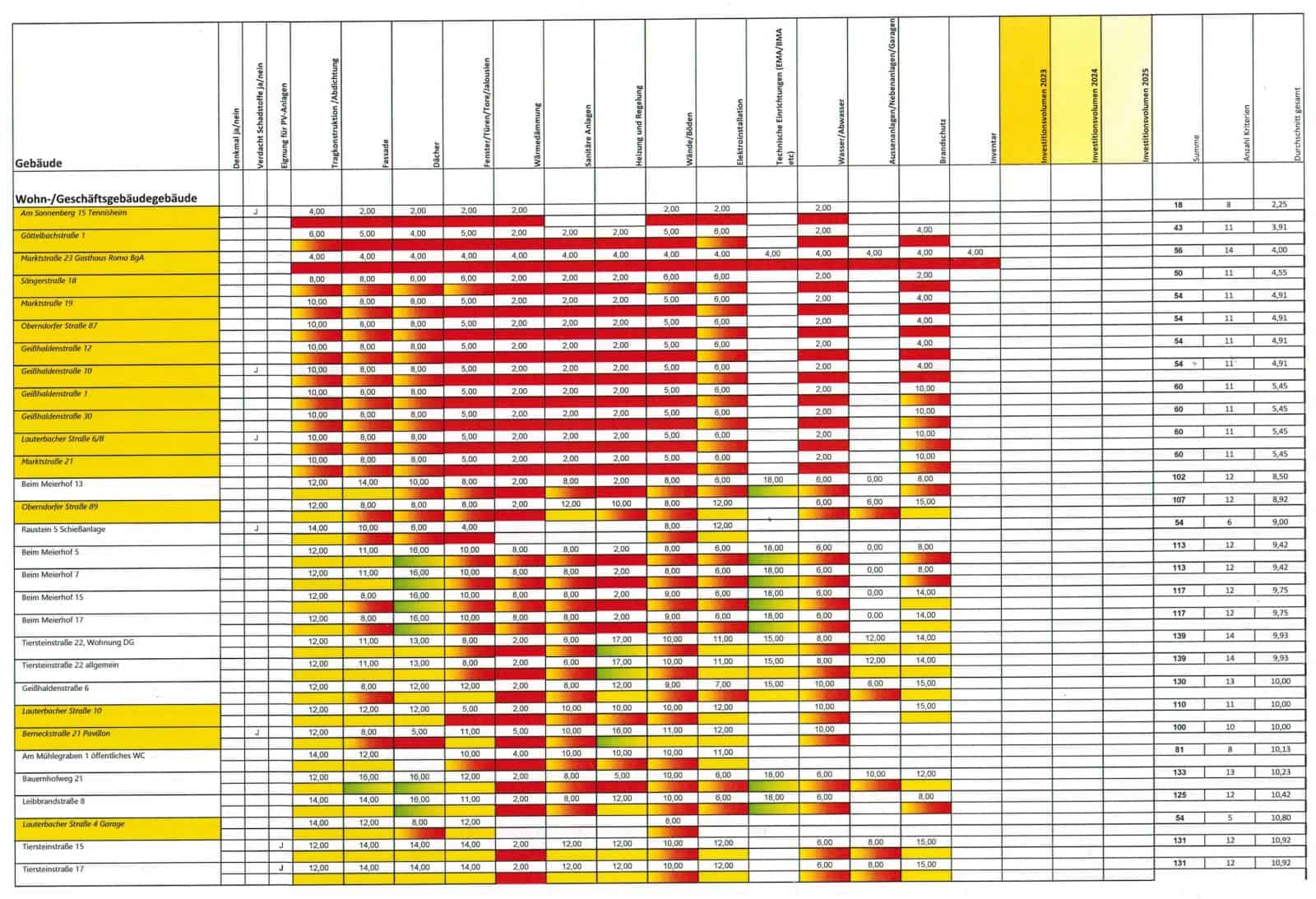 Die Listen sind dann dieser Bewertungsskala entsprechend sortiert, die schlechtesten Gebäude oben, die besten unten. Ebenfalls angefügt sind drei Spalten für mögliche Investitionssummen in den nächsten Jahren. Diese müssten aber noch geschätzt werden.
