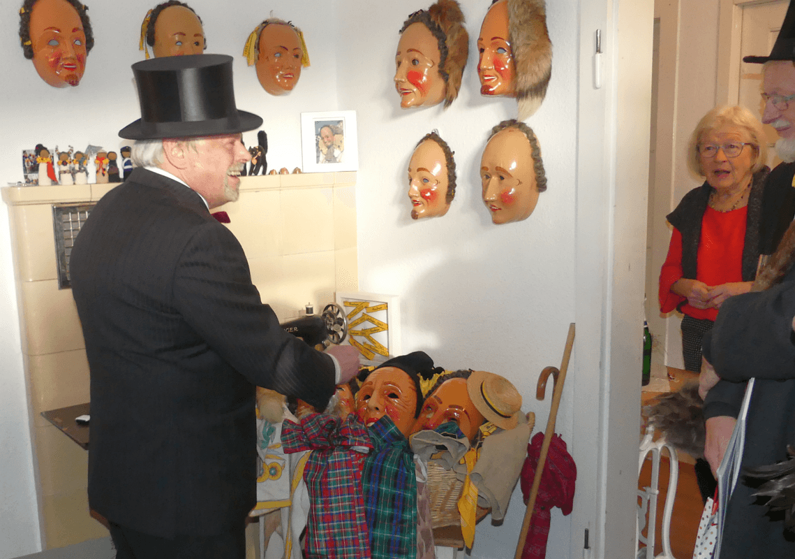 Die einzelnen Abstaubergruppen bekamen kleine Tütle oder „Gückle“ mit. Darin hatte Cathrine Dold in kleinen Holzschächtele Hanselmäskle verstaut. Außerdem gab es Prospekte für die Hanselausstellung, die die Elfer verteilen sollten.