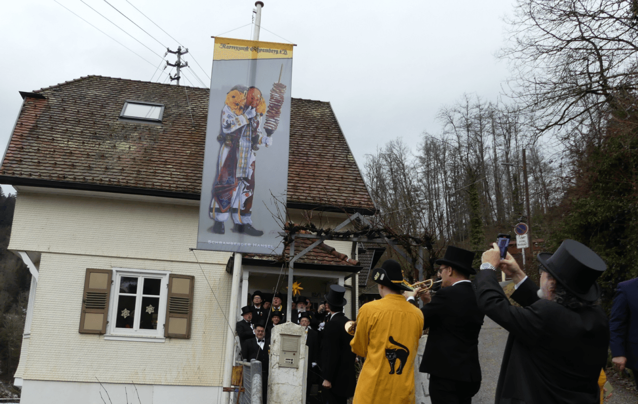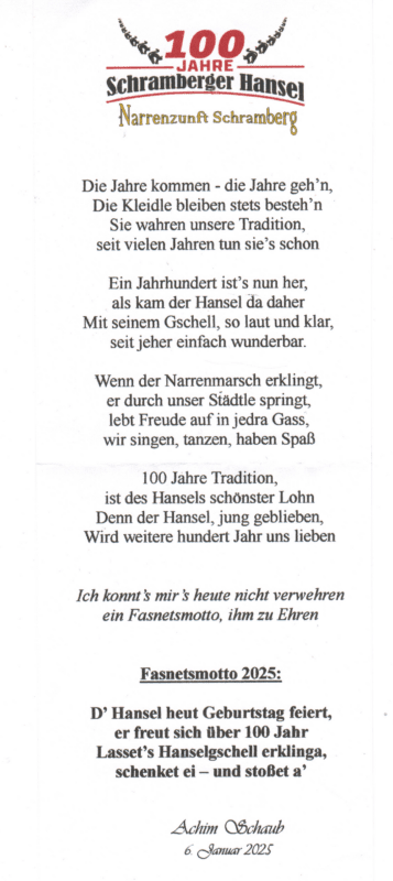 Ausführlich ging Tobse Dold auf das Jubiläum ein: 100 Jahre Schramberger Hansel. Im Stadtmuseum werde es dazu eine Ausstellung geben. Gerd Pflumm habe aus diesem Anlass eine Fahne mit dem Hansel in Lebensgröße gestaltet. Damit sei Pflumm „ein weiteres Meisterwerk gelungen, das nun die Häuser in Schramberg schmücken kann“.