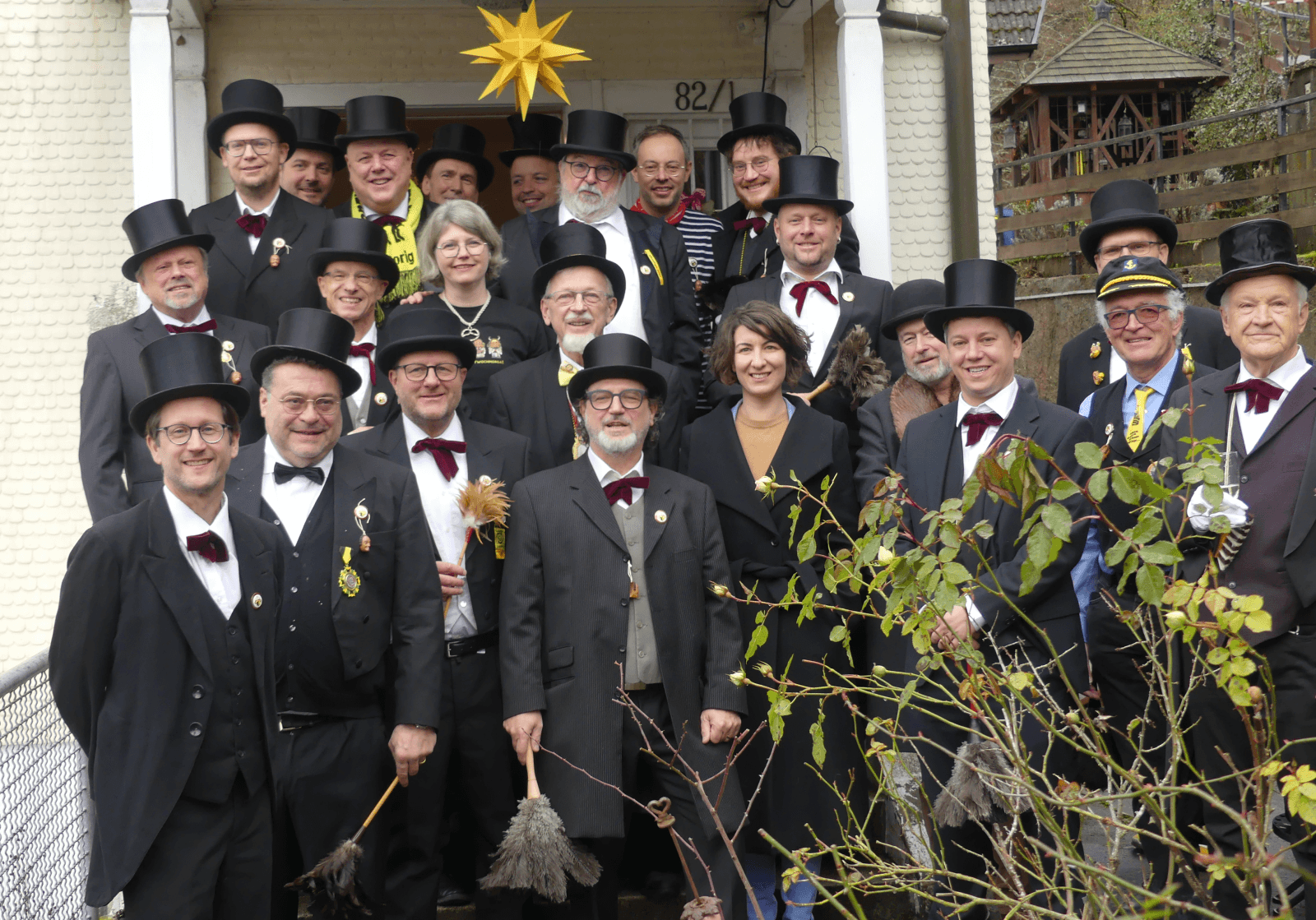 Nachdem alle Elfer und Obernarren ordentlich Staub aufgewirbelt hatten, begaben sich alle vor das Doldsche Wohnhaus. Tobse Dold zog erstmals die neue Hansel-Fahne hoch, viel bestaunt von den Elfern.
