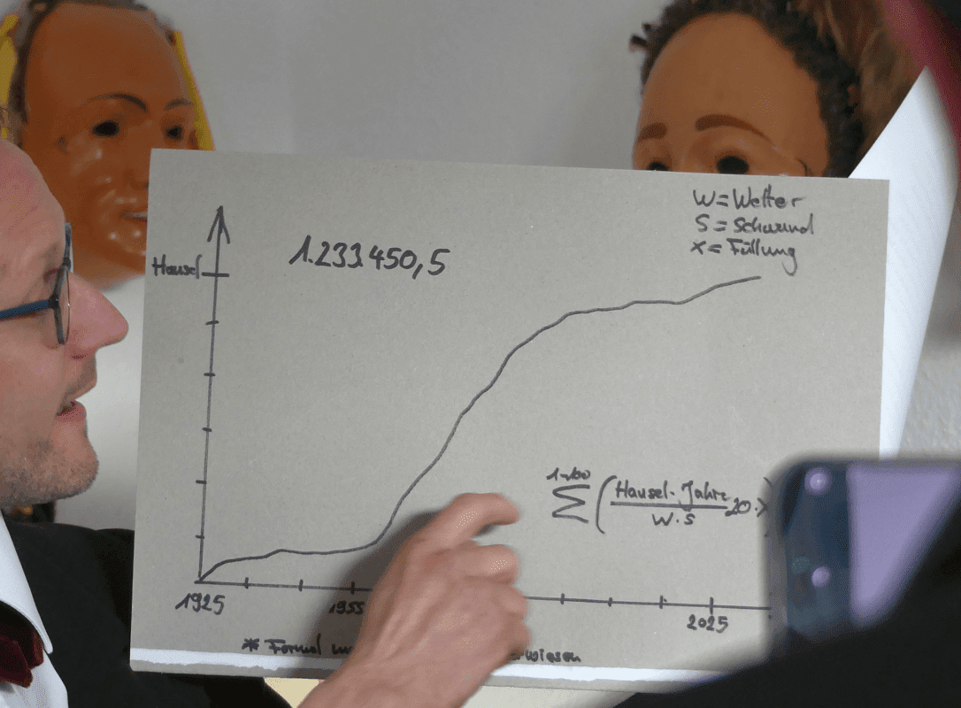 Auf einem Karton hatte Dold eine Kurve gezeichnet und die Berechnungsformel notiert. Als er den Karton hochhielt, brachte ihm das den Zuruf von Obernarr Edgar Reuter ein: „Jawohl, Herr Habeck!“.