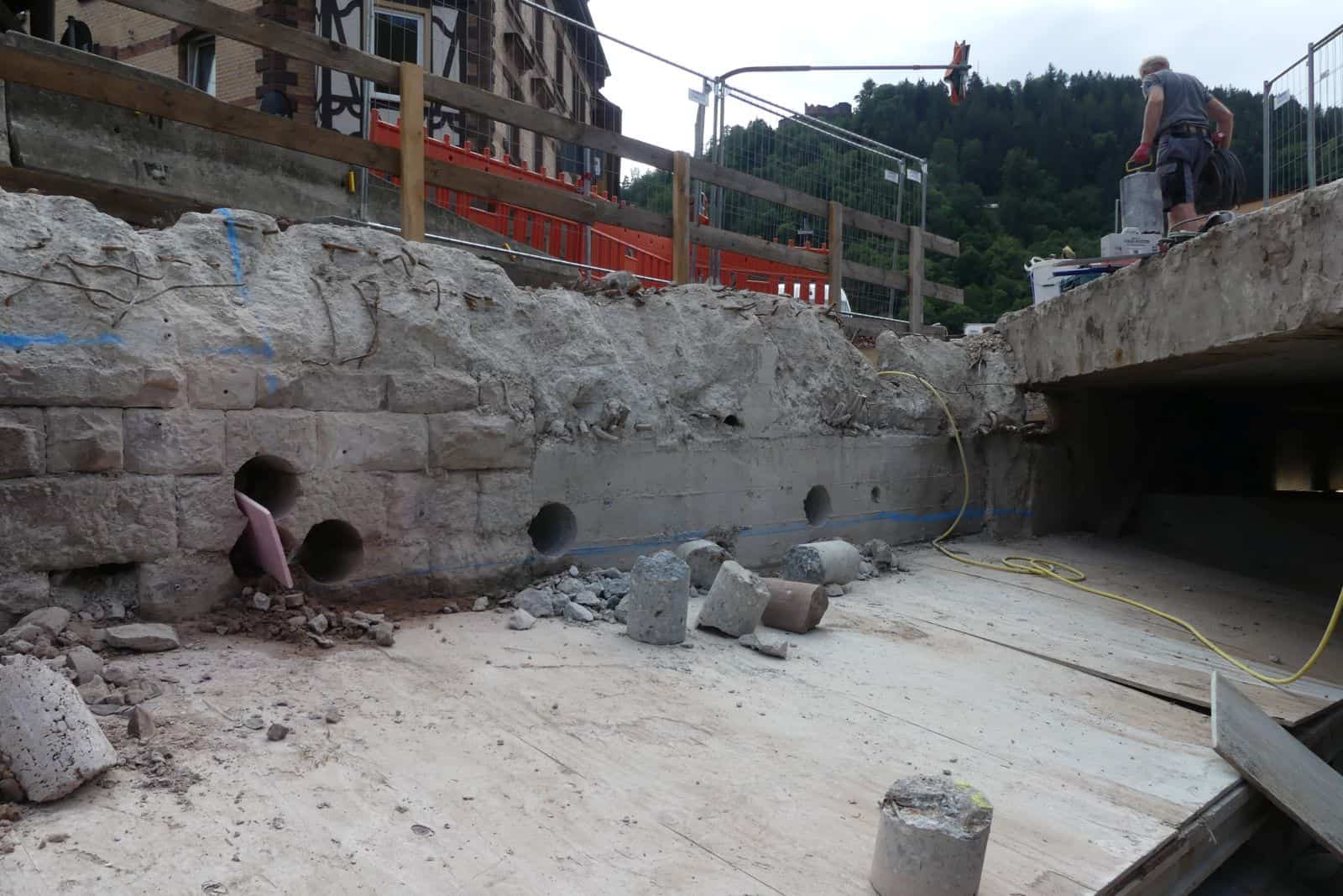 In der Verdolung selbst gehen die Arbeiten unterdessen weiter. In den vergangenen Wochen hatten Spezialisten mit Hochdruckwasserstrahlen den losen beton entfernt und den darunter liegenden Baustahl gereinigt, berichtet Holzbaur. „Auf die freigelegten Stellen wird jetzt Spritzbeton aufgetragen.“