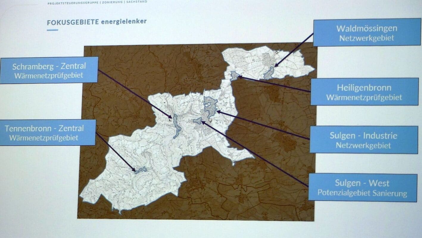 Bei diesen Gebieten sollte beispielsweise genauer untersucht werden, ob in der Talstadt im Zentrum ein Wärmenetz Sinn machen würde. Ähnliches gilt in Tennenbronn in der Ortsmitte. Für die Industriegebiete in Sulgen und in Waldmössingen könnte ebenfalls ein Netzwerk sinnvoll sein. In Heiligenbronn plant die Stiftung neue Gebäude, auch hier wäre ein Wärmenetzprüfgebiet. In Sulgen im Westen des Eckenhofs schließlich sehen die Gutachter ein „Potenzialgebiet Sanierung“.
