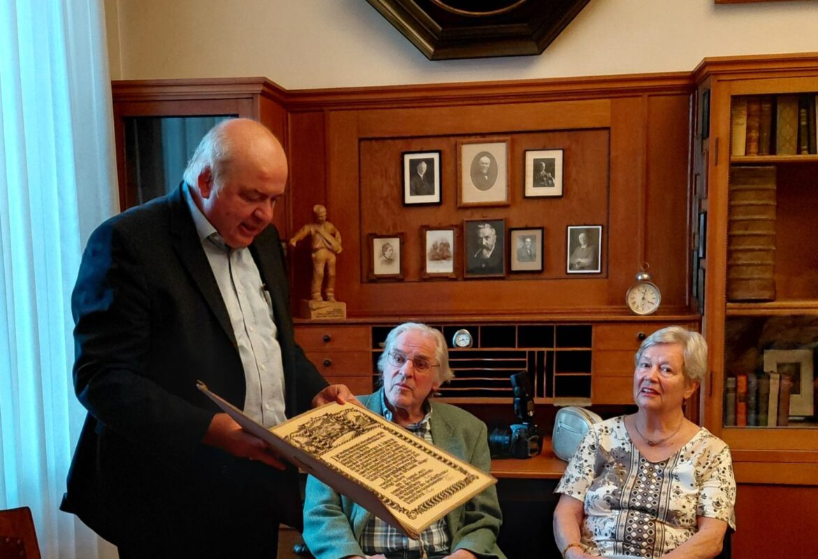 Die Ehrenbürgerurkunde mit der St. Mariakirche links, einer Ansicht der H.A.U. und dem Rathaus. . Foto: him