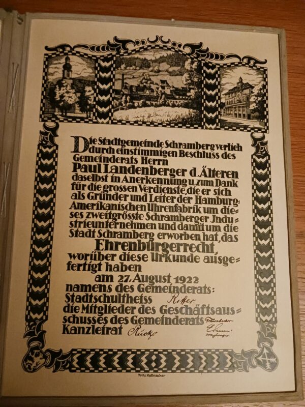 Hergestellt hat es die firmeneigene Schreinerei. Neben Büchern, Familienportraits und -gemälden befindet sich hier auch die Ehrenbürgerurkunde Landenbergers. Schramberg hatte ihn 1922 zum Ehrenbürger ernannt.