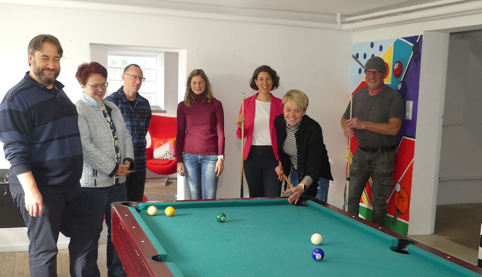 Am Billardtisch im Doppelpunkt (von links): Etienne Seif, Leiter Hochbau, Fachbereichsleiterin Susanne Gwosch, Konrektor Nikolai Großhans von der Peter-Meyer-Schule, Abteilungsleiterin Kerstin Flaig, Oberbürgermeisterin Dorothee Eisenlohr, Christiane Haas vom Doppelpunkt und Christoph Raetzer von der Abteilung Hochbau. Foto: him