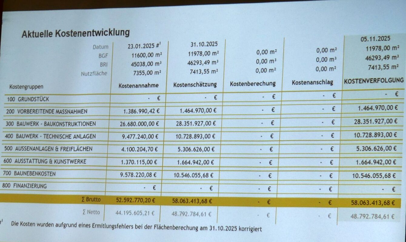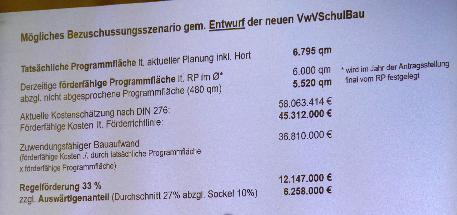 Bei Gesamtkosten von 58 Millionen wären 45 Millionen Euro förderfähig Der zuschussfähige Bauaufwand läge bei 36,8 Millionen. Davon würde das Land 33 Prozent übernehmen also etwa 12 Millionen. Hinzu könnte ein Zuschuss von 6,2 Millionen Euro wegen der auswärtigen Schüler kommen.  „Die neue Förderung wäre höher als bisher“, so Flaig.