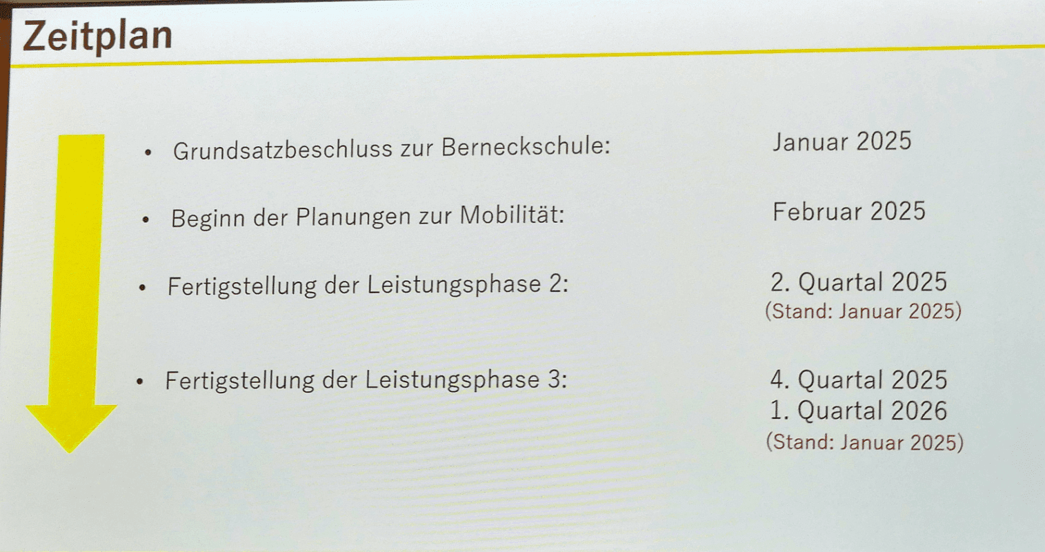 Inzwischen aber scheint wieder mehr Tempo in die Sache zu kommen. Auch eine Grundsatzentscheidung zur Zukunft der Berneckschule war für die Planer wichtig. Die Architekten haben die Leistungsphase 2 weitgehend abgeschlossen. Das heißt, die Grundlagenermittlung und die Vorplanung liegen größtenteils vor. Im zweiten Quartal 2025 wollen die Architekten diese und eine konkrete Kostenberechnung vorlegen.