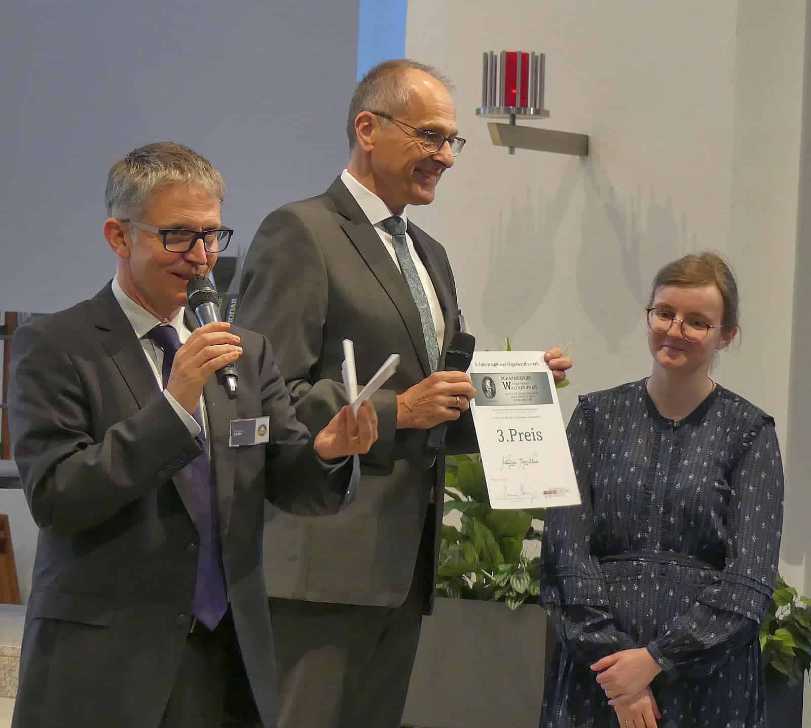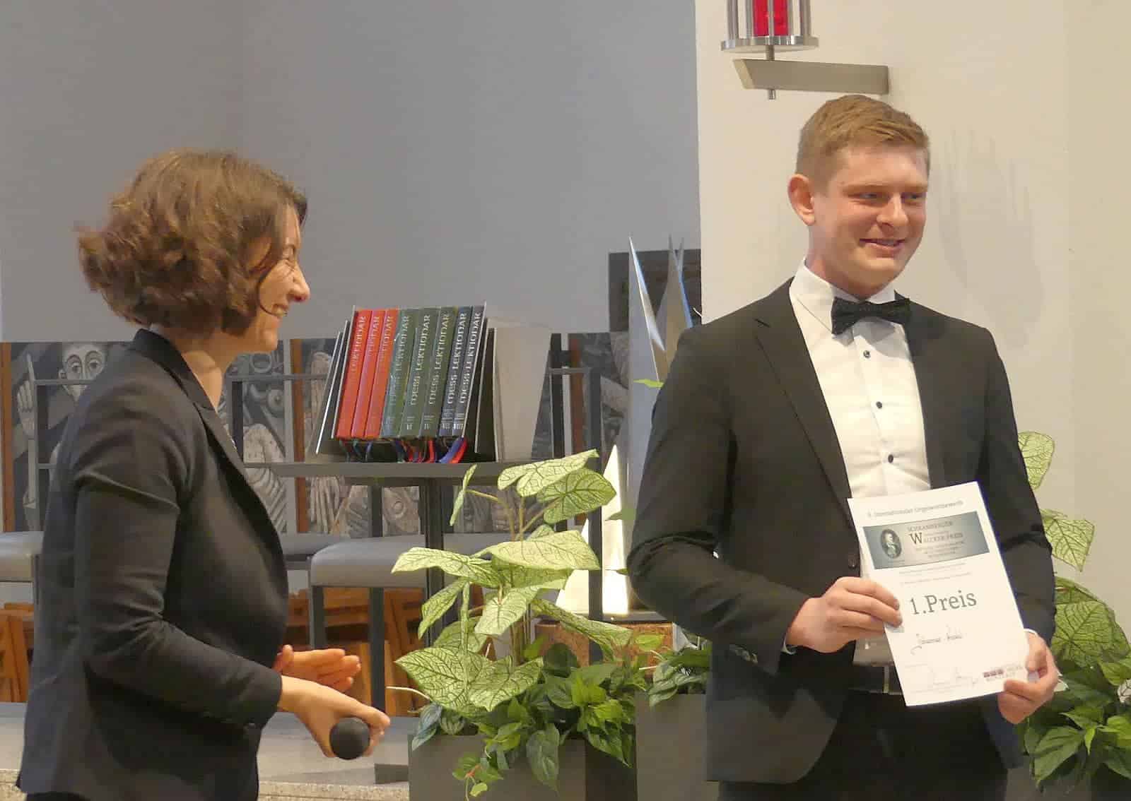 Damit war klar, dass den mit 5000 Euro dotierten ersten Preis Johannes Krahl gewonnen hatte. Ihn überreichte Schrambergs Oberbürgermeisterin Dorothee Eisenlohr, die auch die Schirmherrin des Wettbewerbs war. Sie bedankte sich im Namen der Stadt bei den Organisatoren des Wettbewerbs. Er sei inzwischen wie die Walcker-Orgel ein Markenzeichen der Stadt. Dem Sieger wünschte sie viel Erfolg bei seiner Karriere.