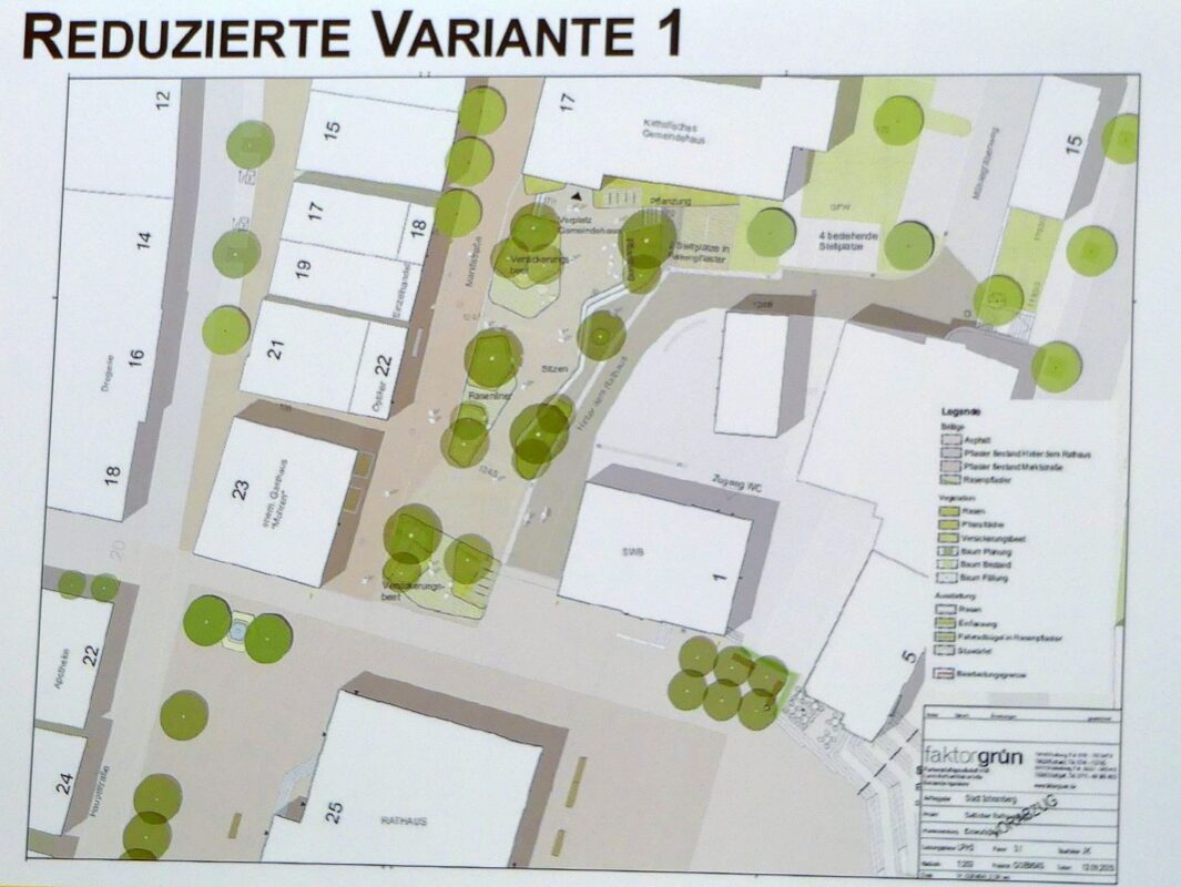 Es handele es sich „um einen zentralen Platz im Herzen der Stadt, an dem jeder Besucher und jeder Einkaufsgast vorbeikommt“. Der Platz sei auch für diejenigen gedacht, die keinen eigenen Garten hätten, so Eisenlohr, Menschen, „die nicht so viel Glück haben, und die viel Zeit hier draußen, rund ums Rathaus, verbringen“. Eine ansprechende Platzgestaltung könnte helfen, weitere Menschen in die Stadt zu locken und so dem Einzelhandel helfen.