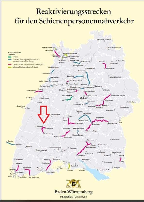 Betrachtet man nun die vom Landesverkehrsministerium vorgelegte Übersichtskarte zu den Bahnprojekten, kommen dem Betrachter auch hier Zweifel an der Kompetenz der Beteiligten. Statt die tatsächliche Verbindung Schiltach – Schramberg zu markieren, zeichnen sie eine Strecke, die von Schiltach über Hausach nach Schramberg führt.