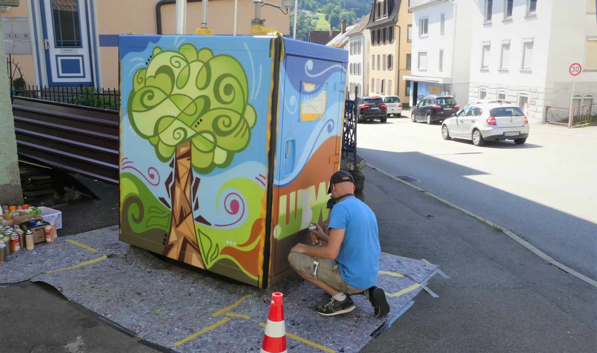 Die LUBW-Verantwortlichen sagten sich vor zwei Jahren: Lasst und die beigen Kästen etwas auf hübschen. Und da in Großstädten wie Freiburg, Stuttgart oder Karlsruhe bereits illegale Sprayer die Wände der Stationen ver(un)ziert hatten, war die Idee schnell geboren, einen Profi-Sprayer ran zu lassen.
