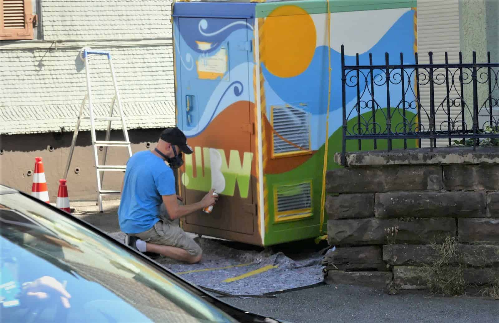 Nicht heimlich in der Nacht, sondern am helllichten Tag hat Simon Löchner seine Spraydosen ausgepackt und sprüht Lackfarben auf den langweilig beigen Kasten an der Oberndorfer Straße.