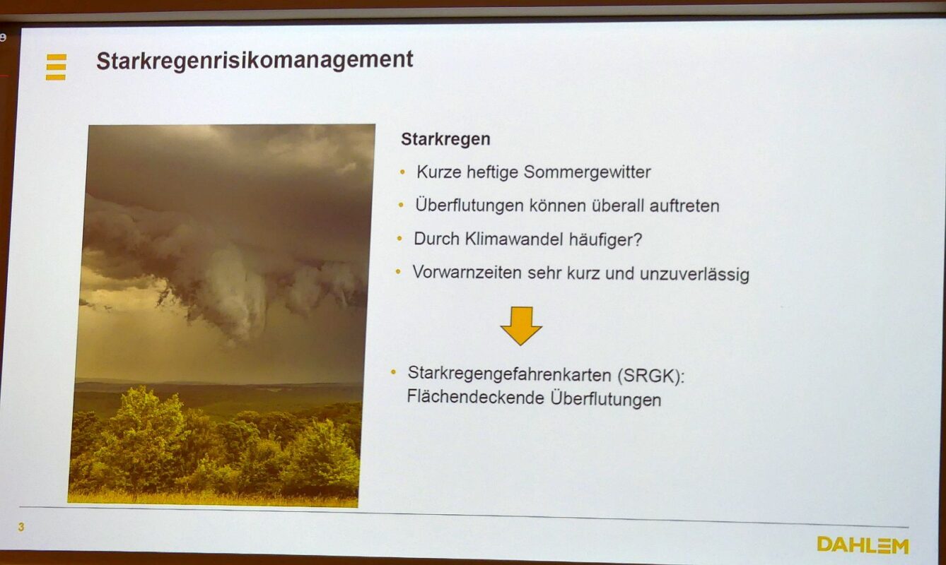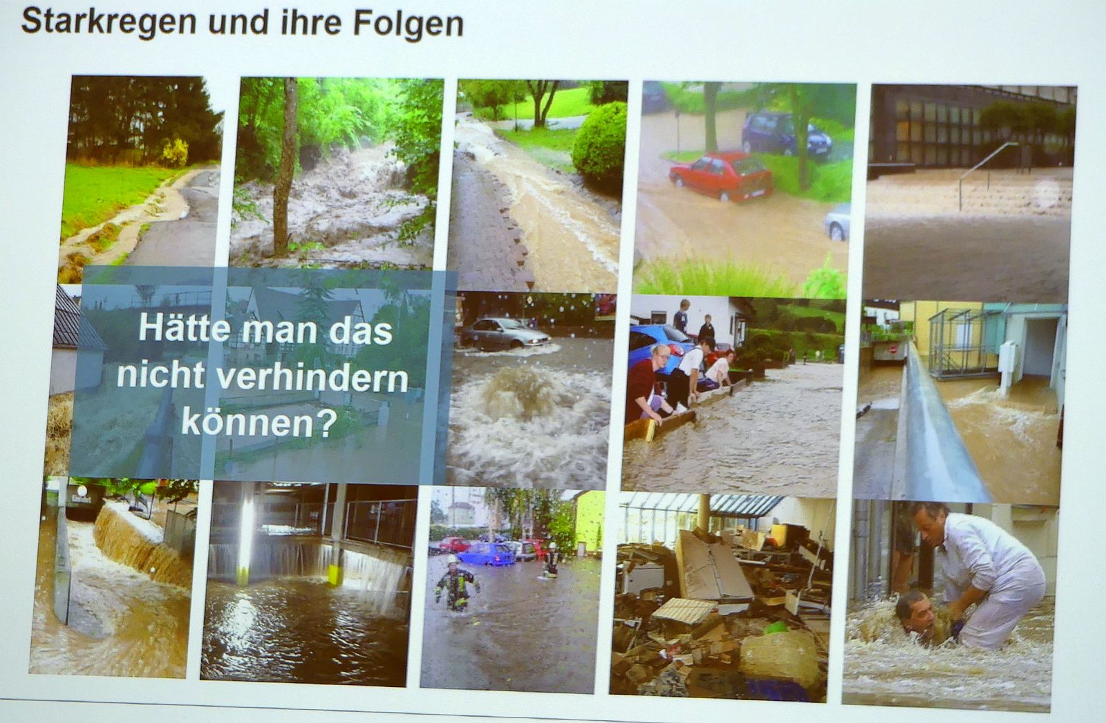 In ihrem Vortrag erläuterte Ulla Leinweber vom Büro Dahlem den Unterschied zwischen Hochwasser und Starkregen. Letzteres bedeute starken Niederschlag in kurzer Zeit. Man untersuche, wo das Wasser stehen bleibt. Im Gegensatz dazu beschäftige einen das Hochwasser in erster Linie, wenn Bäche und Flüsse über die Ufer treten.