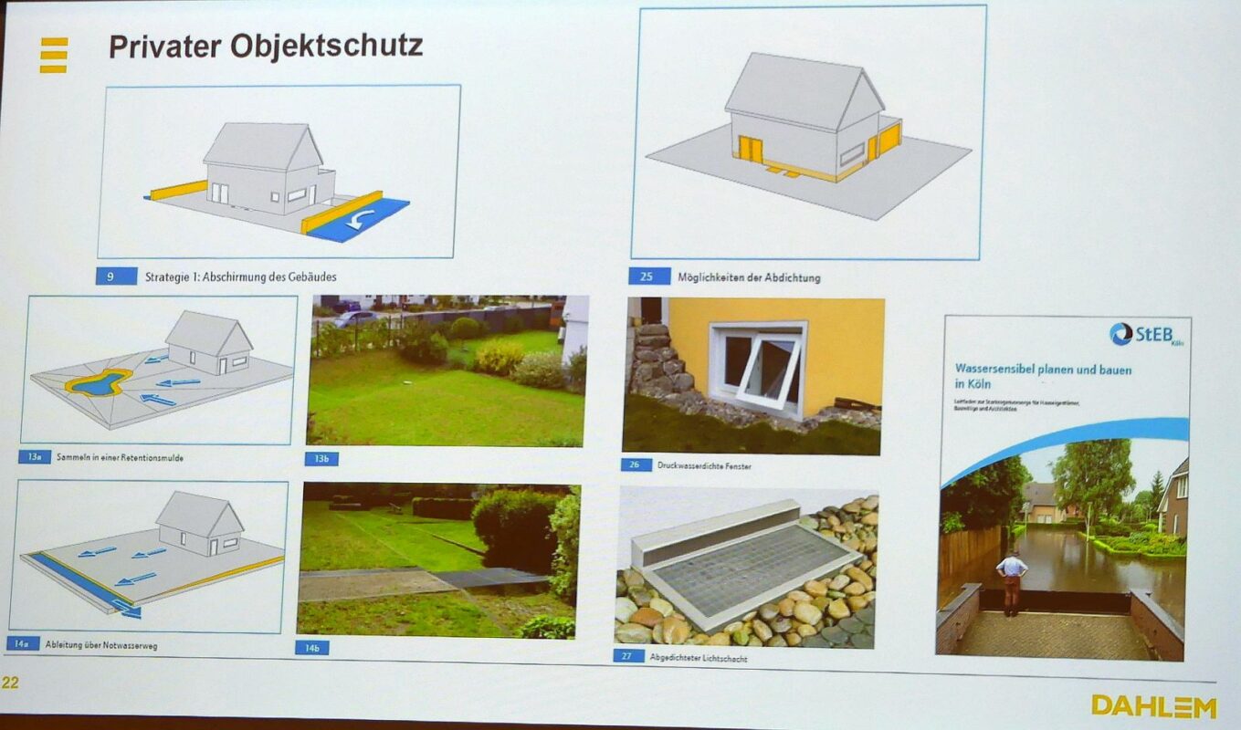 Es sei wichtig, dass private und kommunale Stellen zusammenarbeiten. Schon bei der Bauplanung sollte man die Gefahren berücksichtigen. Auch „Gelegenheitsfenster“ zu nutzen, sei wichtig. Wenn eine Straße gerichtet werde, solle man schauen, was man zum Thema Starkregen gleich mit machen kann.