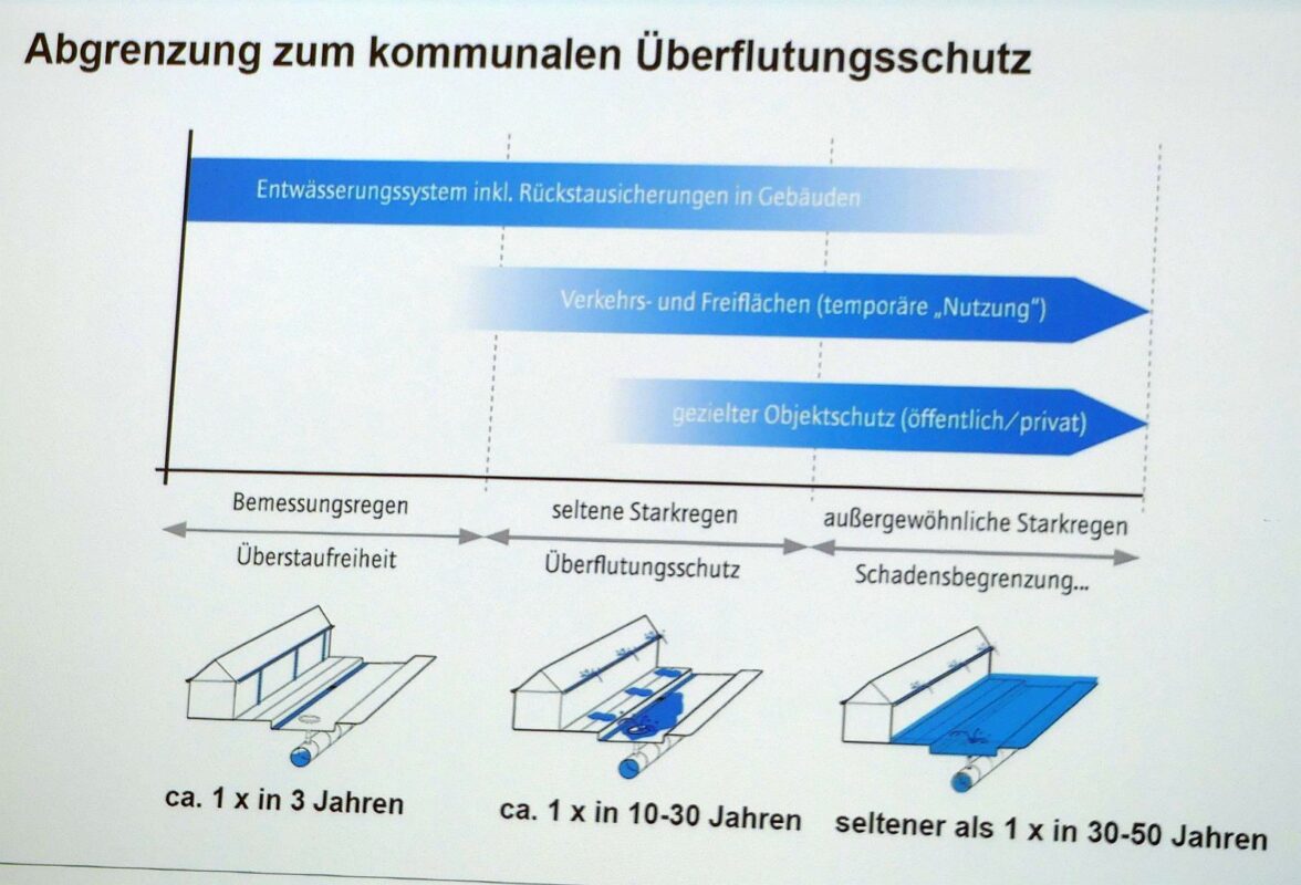 Beim Starkregen unterscheide man Ereignisse, die hin und wieder auftreten, von solchen, die es nur alle paar Jahre oder noch seltener alle 30 bis 50 Jahre zu bewältigen gilt.