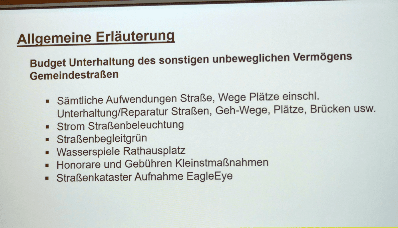 Schramberg. Man könne es auch positiv sehen, so Ginter: „Es wurde viel geschafft.“  Er erläuterte den Ausschussmitgliedern, welche Ausgaben sich im Budget Straßenunterhalt verbergen. Das reiche von der Reparatur von Straßen und Wegen, dem Strom für die Straßenbeleuchtung und die die Pflege des Straßenbegleitgrüns bis zu den Wasserspielen am Rathausplatz und den „Eagle-Eye“- Aufnahmen für das Straßenkataster.