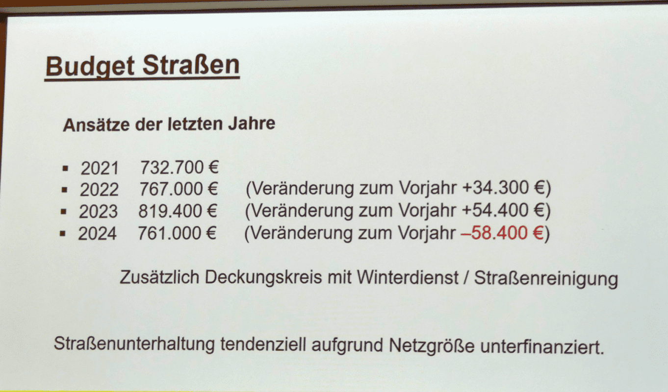Sichtlich unangenehm war es dem Leiter der Abteilung Tiefbau Konrad Ginter, dass er im Ausschuss für Umwelt und Technik erneut um einen Nachschlag für seine Abteilung bitten musste. Für Straßenunterhalt waren 2024 etwa 120.00 Euro zu wenig eingeplant. Der Ausschuss hat die überplanmäßigen Mittel einstimmig bewilligt.