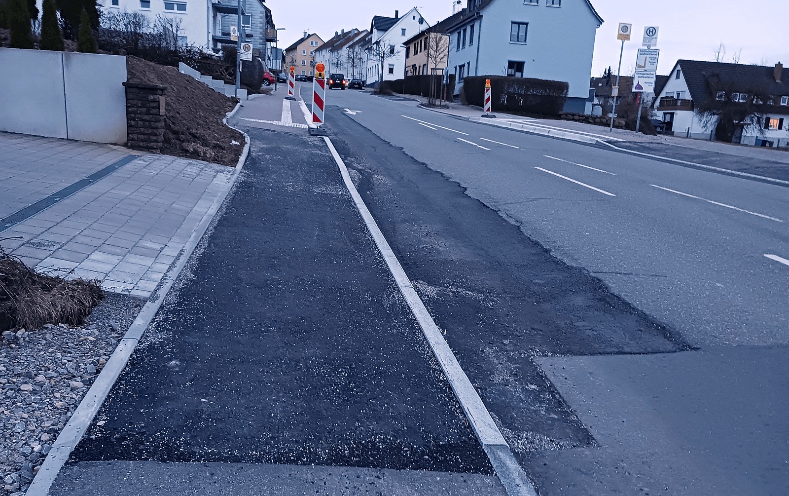 Auch solche Arbeiten werden aus dem Etat für Straßenunterhalt bezahlt.: Neuer Asphaltbelag an der Bushaltestelle Schramberger Straße in Sulgen. Foto: him