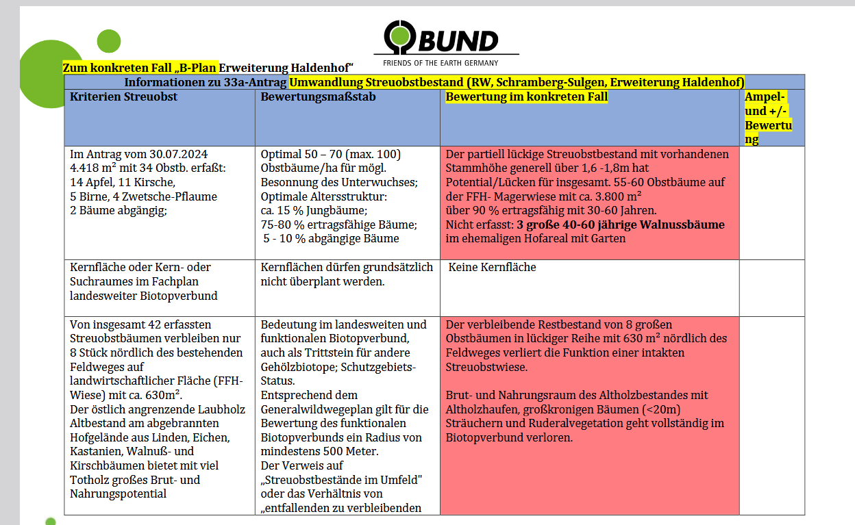In der Stellungnahme, die der NRWZ vorliegt, kommt die BUND-Regionalgeschäftsführerin Katharina Baudis zum Schluss: „Nach unserer Einschätzung handelt es sich um einen hochwertigen, alten Streuobstbestand mit überdurchschnittlicher Lebensraum- und Artenausstattung. Die genannten Kompensations- und Ausgleichsmaßnahmen können den Verlust nicht in gleichem Maß ausgleichen.“