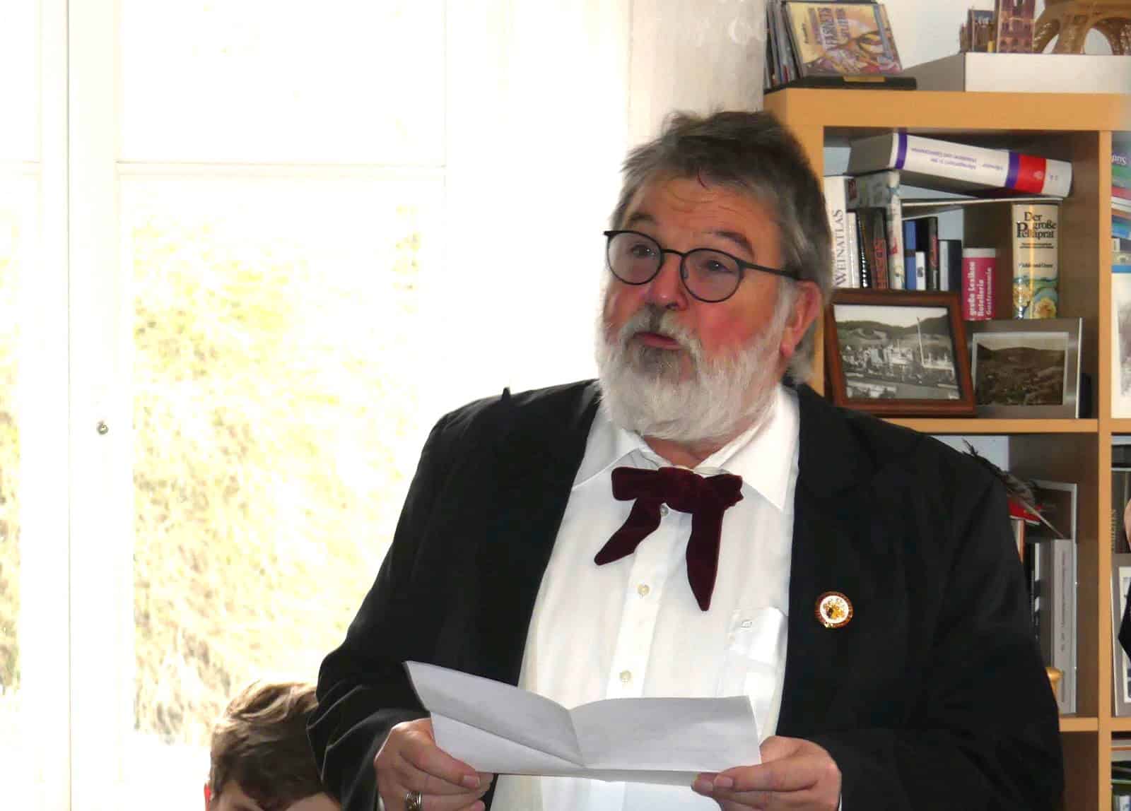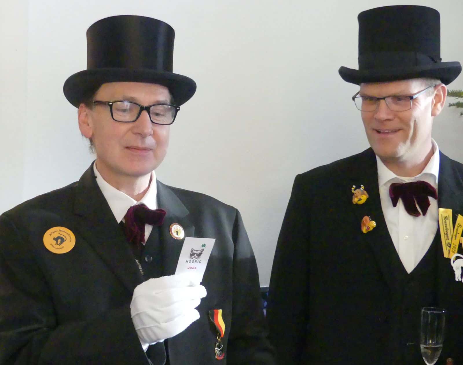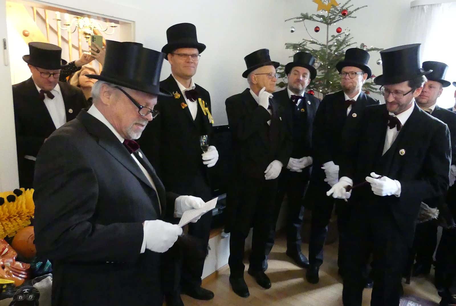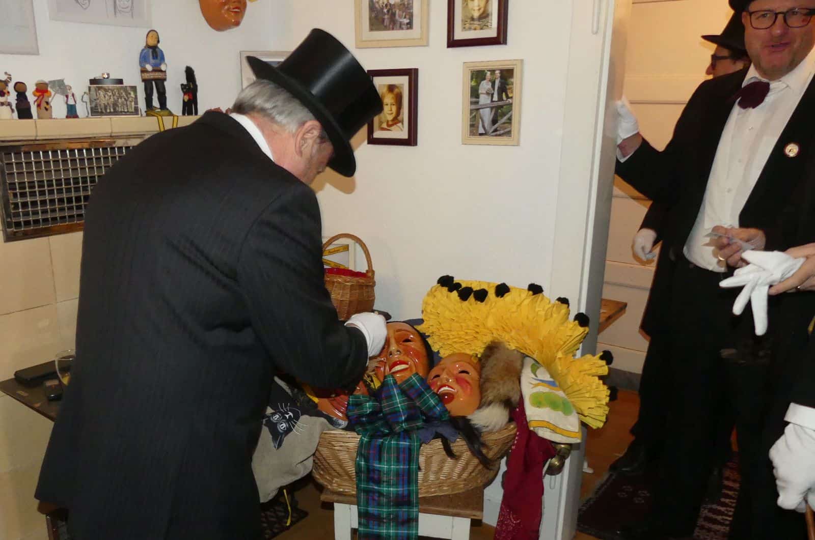 Bevor mit Zylinder und weiß behandschuht Ehrenzunftmeister Hubert Dold an die Larven seines Sohns und dessen Familie trat, tat auch er noch eine Rede halten. „Was? Quatscht der au no?“ war leise zu vernehmen. Er wünschte sich für dieses Jahr „eine grandiose Fasnet. Prost.“