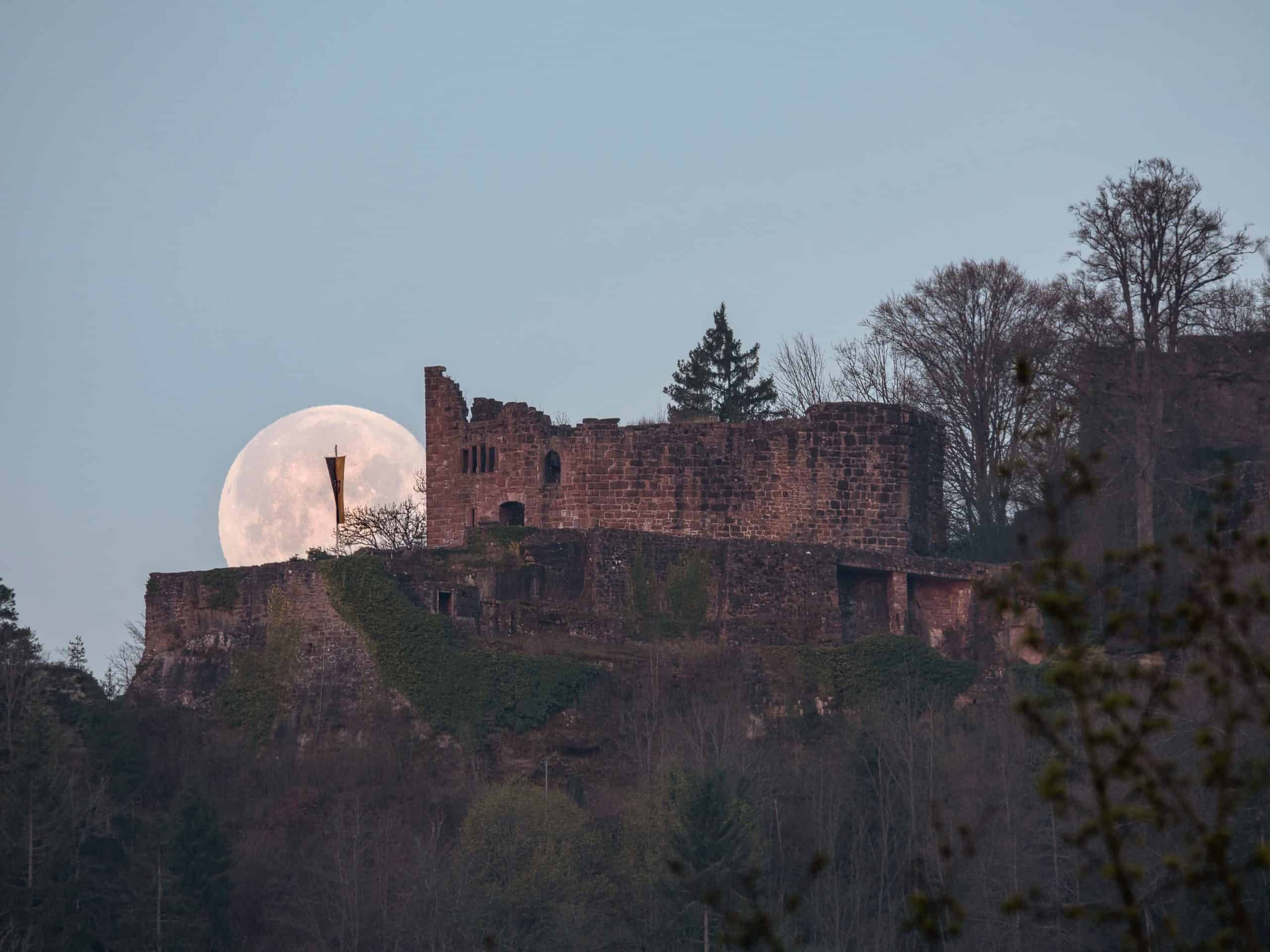 Der Supermond über der Hohenschramberg am frühen Dienstagmorgen. Während der Mond unterging, zeigte sich langsam die Sonne und legte die Burg in ein besonders sanftes Licht.