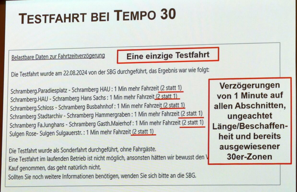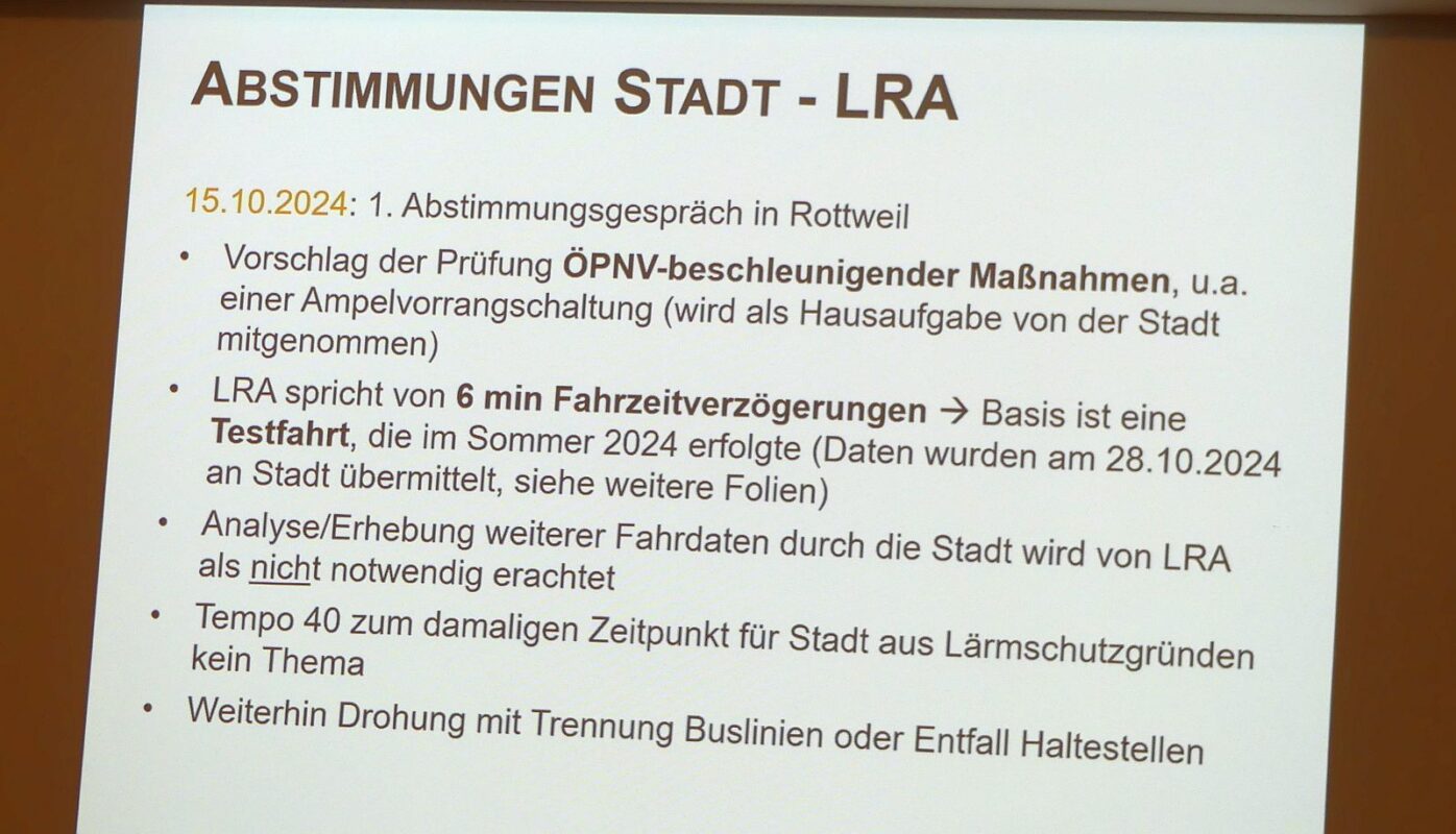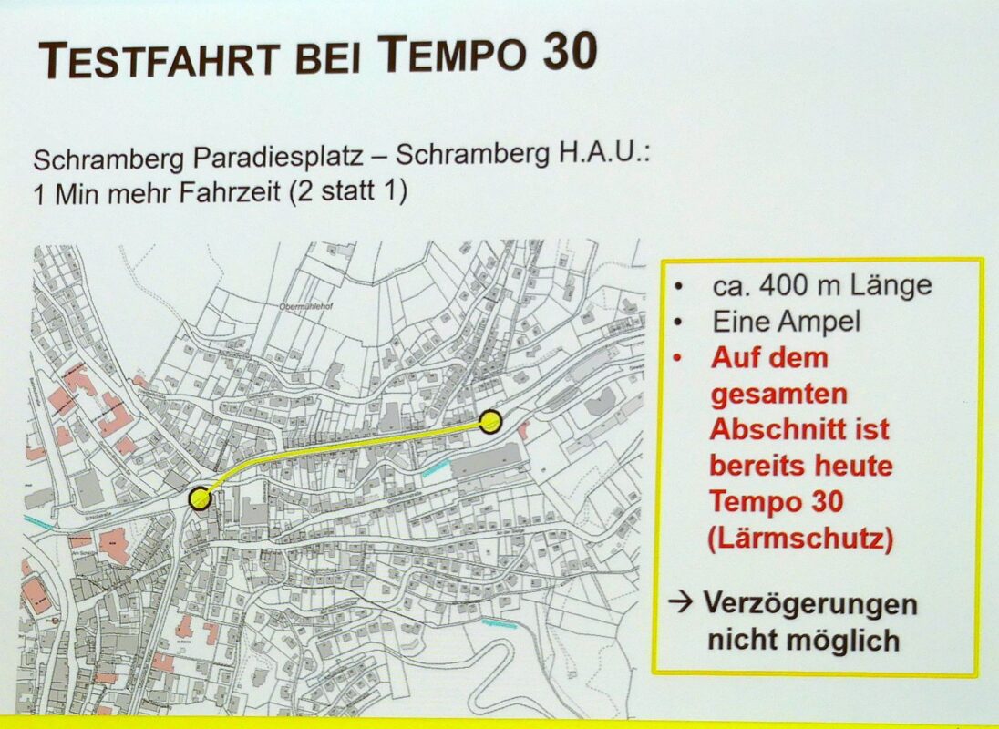 Schneider hat berichtet, dass die Stadtverwaltung die Fahrzeitverzögerungen des Regiobusses in der Talstadt nicht nur bei Geschwindigkeitsreduzierungen von 50 auf 30, sondern auch von 50 auf 40 Stundenkilometer hat berechnen lassen: „Insgesamt belaufen sich die Verzögerungen durch Tempo 40, wie erwartet, auf ein geringeres Maß, was rein rechnerisch bis zu knapp zwei Minuten Unterschied zur Reduzierung auf Tempo 30 ausmachen kann.“