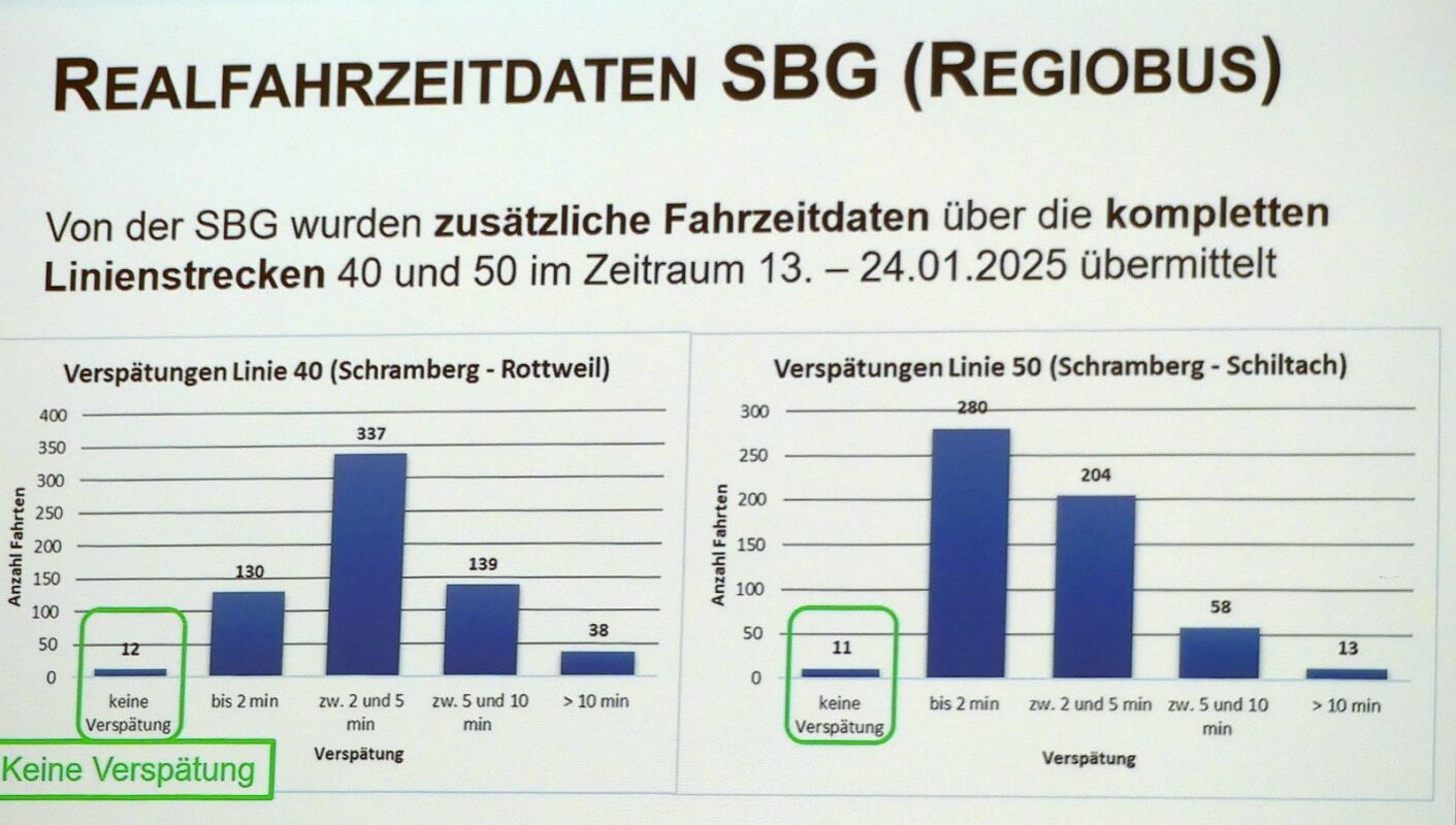 Schneider wies auf die Untersuchung zu den realen Fahrtzeiten der Busse hin, die die Stadt ausgewertet hat. Dazu lieferte die SBG die Fahrtzeiten von Anfang Januar 2025. Damals waren 98 Prozent aller Fahrten der Regiobusse nach Schiltach und Rottweil und umgekehrt nicht pünktlich. Schon heute habe „der Regiobus große Probleme, den Fahrplan einzuhalten“, schloss Schneider in ihrer Vorlage.