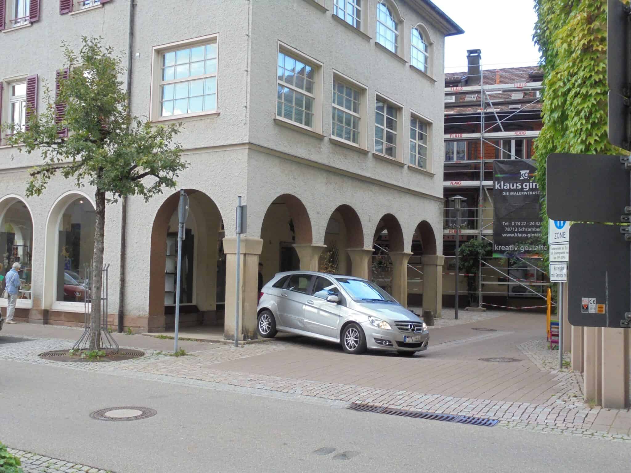 Unterdessen haben einige Autofahrer eine ungewöhnliche Parkmethode entwickelt: Sie parken ihre Autos am kleinen Platz zwischen dem Blumenladen Tiso und Optik Fischer zwischen den Arkadenbögen ein. Darauf angesprochen  habe ein Autofahrer ihr erklärt, die Stadt habe das erlaubt, erfuhr eine Anwohnerin.