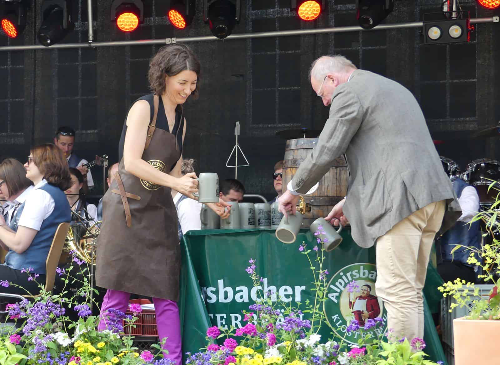 Zum Fassanstich erzählte Eisenlohr Brauereichef Glauner habe sie vorab gefragt ob sie einen spektakulären oder einen normalen Anstich wolle. Das Fassanstechen gehöre zu den „schlimmsten Aufgaben, die sie als Oberbürgermeisterin habe, deshalb habe sie für normal plädiert. Und so geschah es. Anschließend verteilte sie Bierkrüge „mit viel Schaum drin“. Es bildete sich eine kleine Schlange Bierliebhaber, die die Abkühlung genossen.