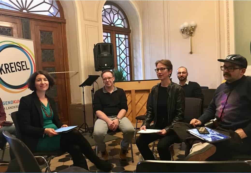 Unter dem Motto „Räume (er)finden zwischen Enge und Weite – Kreative Bildung und lebendige Jugendkultur in ländlichen Räumen“ diskutierte Dorothee Eisenlohr mit den Kreativen Anne Hess und Ira Hugger, Rob Hak und Thomas Kuhner sowie Menja Stevenson vom Landesverband der Jugendkunstschulen. In Vertretung des erkrankten Bernhard Rüth moderierte Jugendkunstschulleiterin Verena Boos die Veranstaltung.