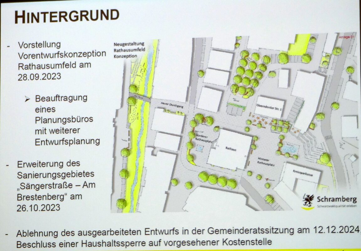 Schramberg. Stadtplaner Joschka Joos warb erneut dafür, das Rathausumfeld attraktiver zu machen. Es solle „mehr grün als auf dem anderen Rathausplatz“ in die Stadt kommen. Das Büro faktorgruen hatte Ende 2024 zwei Varianten für die Platzgestaltung vorgestellt. Der Gemeinderat lehnte das gut 700.000 Euro teure Vorhaben rundweg ab, forderte eine kostengünstigere Variante.
