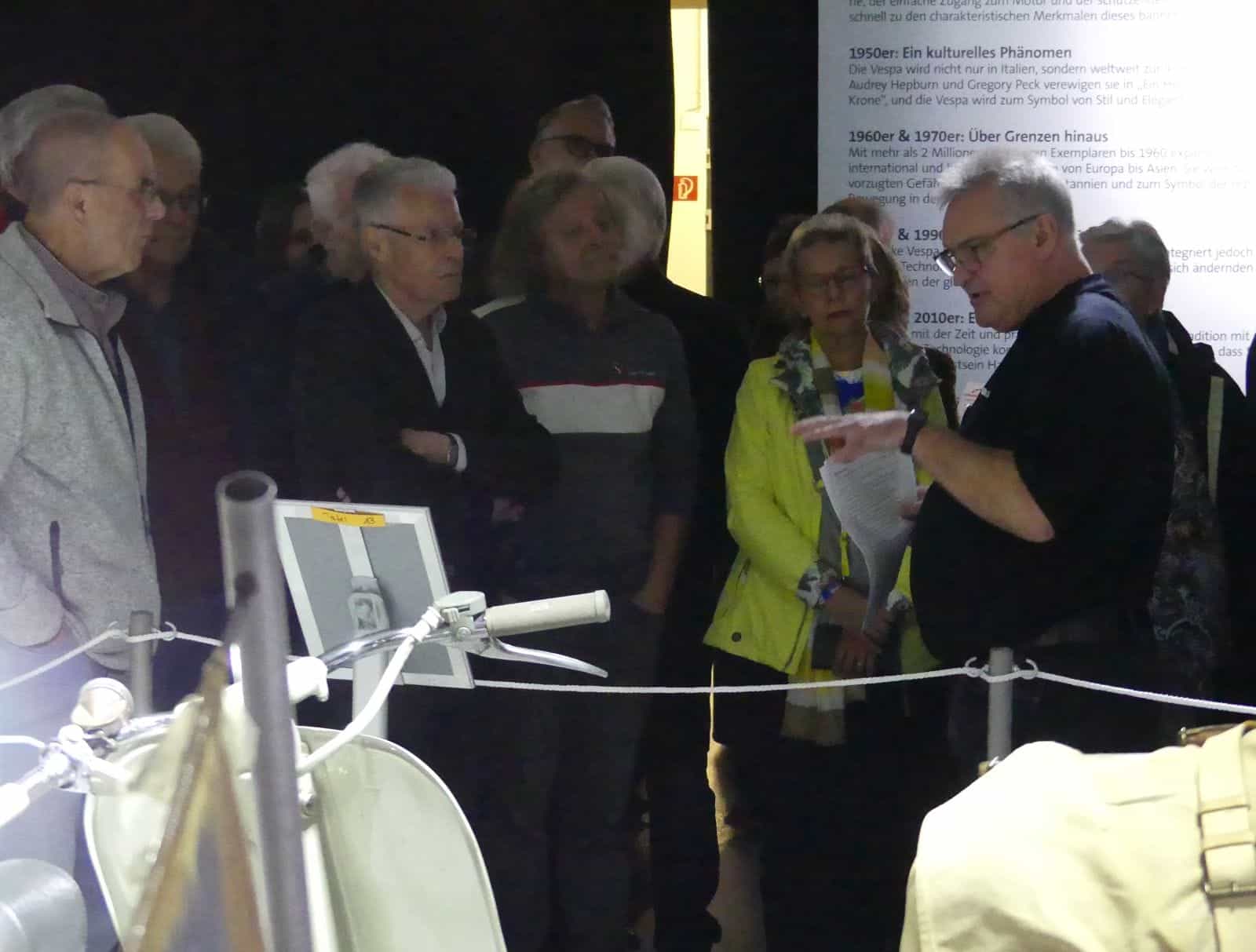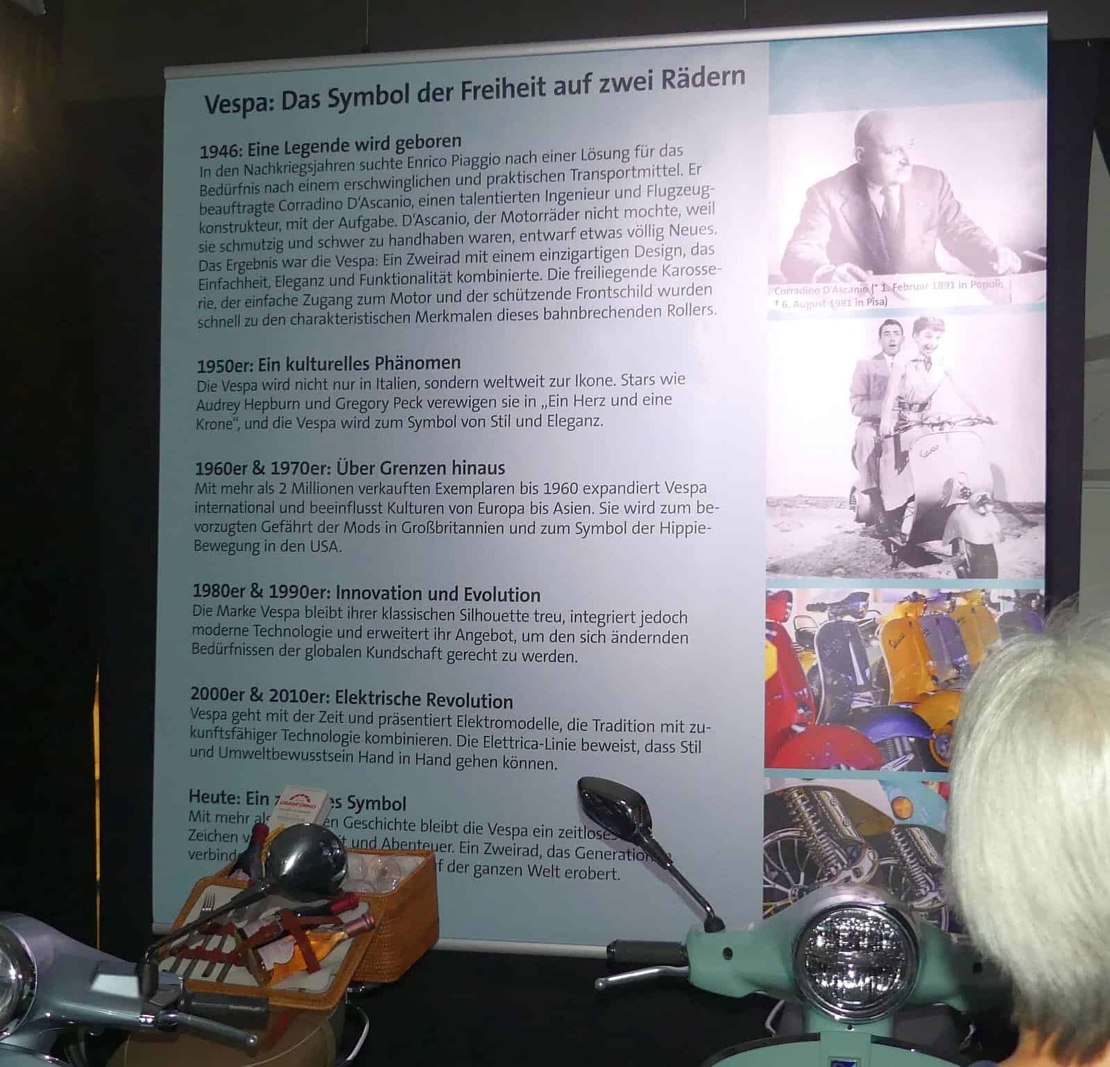 Beim Rundgang durch die Ausstellung erläuterte Klingel weitere Details zur Entwicklungsgeschichte der Vespa. Auf großen Schautafeln können sich die Besucherinnen und Besucher auch selbst informieren.