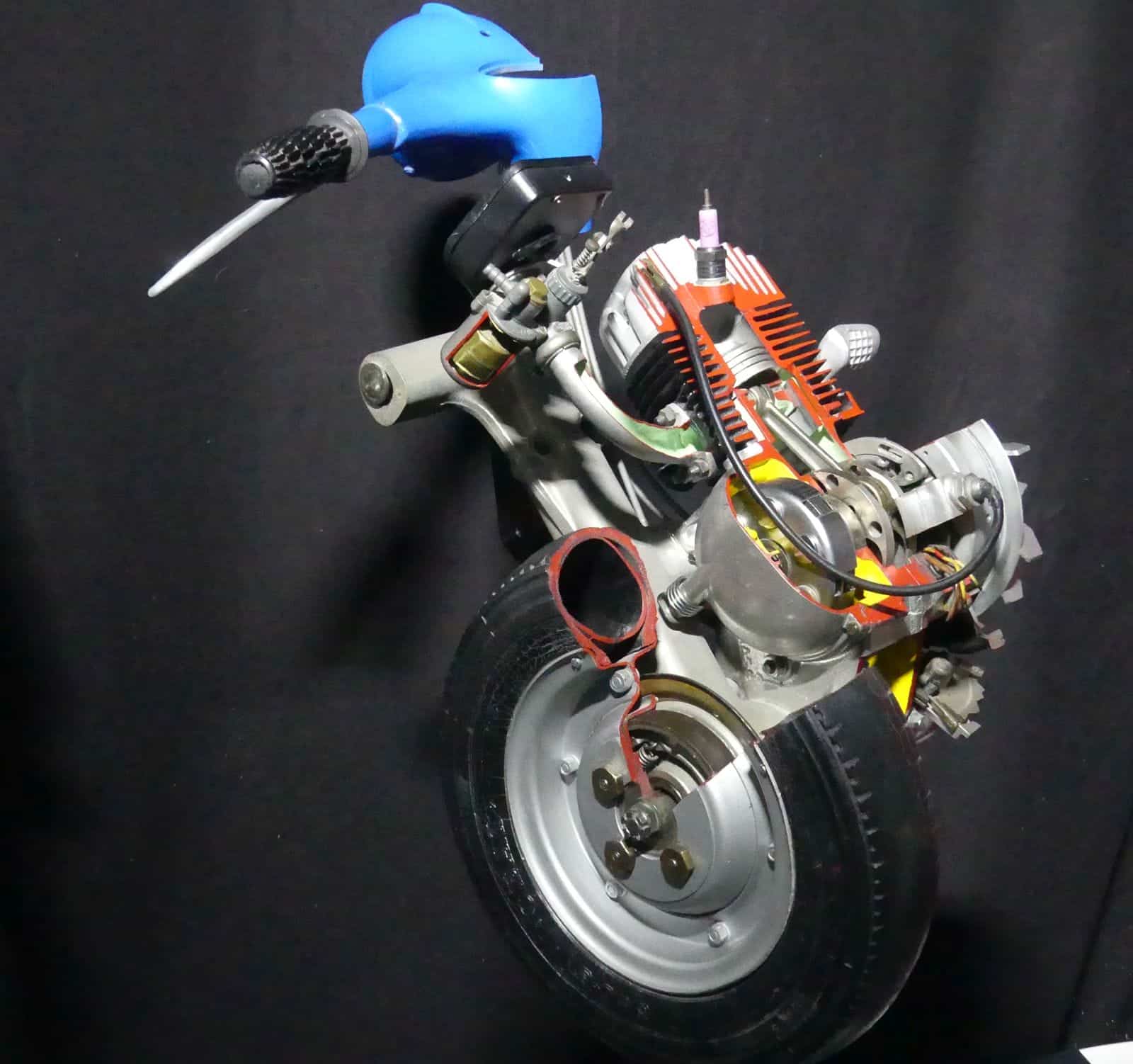 Die Vespa zeichne zwei Merkmale aus: Die selbstragende Karosserie aus Blech und die Triebsatzschwinge am Hinterrad, die sowohl den Motor, die Bremse, der Auspuff als auch die Hinterradaufhängung beinhalte.